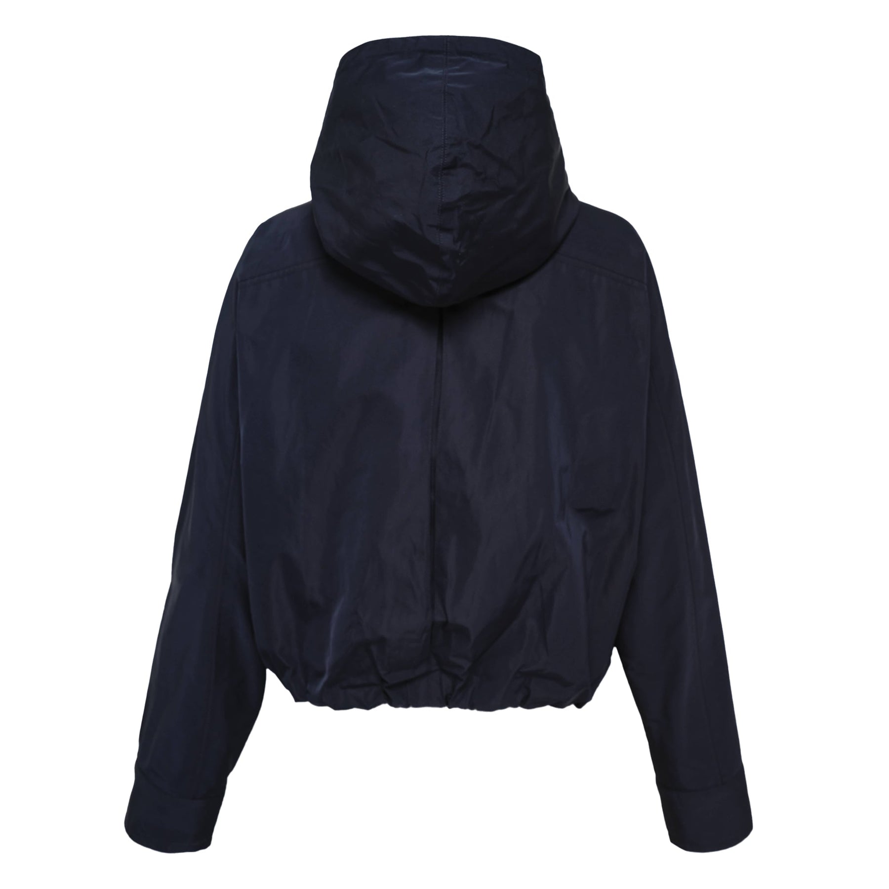 ALAIA Hooded Windbreaker Jacket delivers sophisticated weather protection with luxury fashion sensibilities. Crafted from premium navy polyester with a reversible black interior, featuring full zip closure and adjustable hood. The cropped silhouette and high-end construction elevate casual outerwear with signature ALAIA attention to detail.