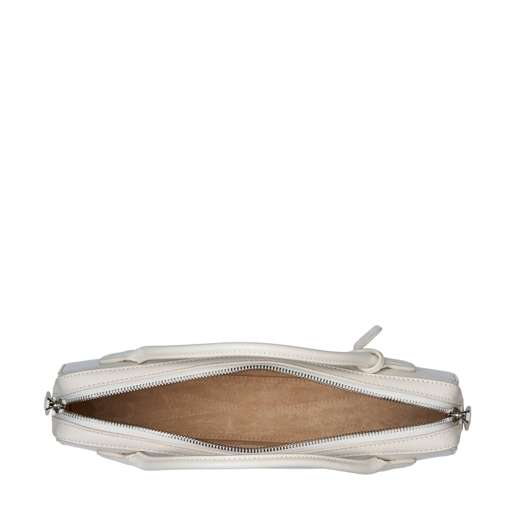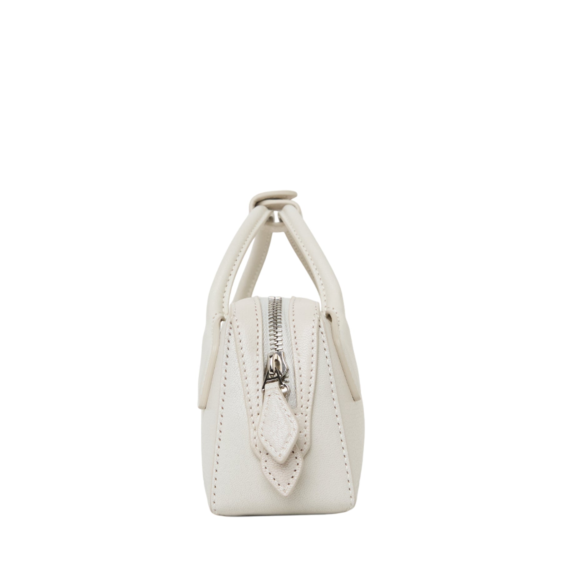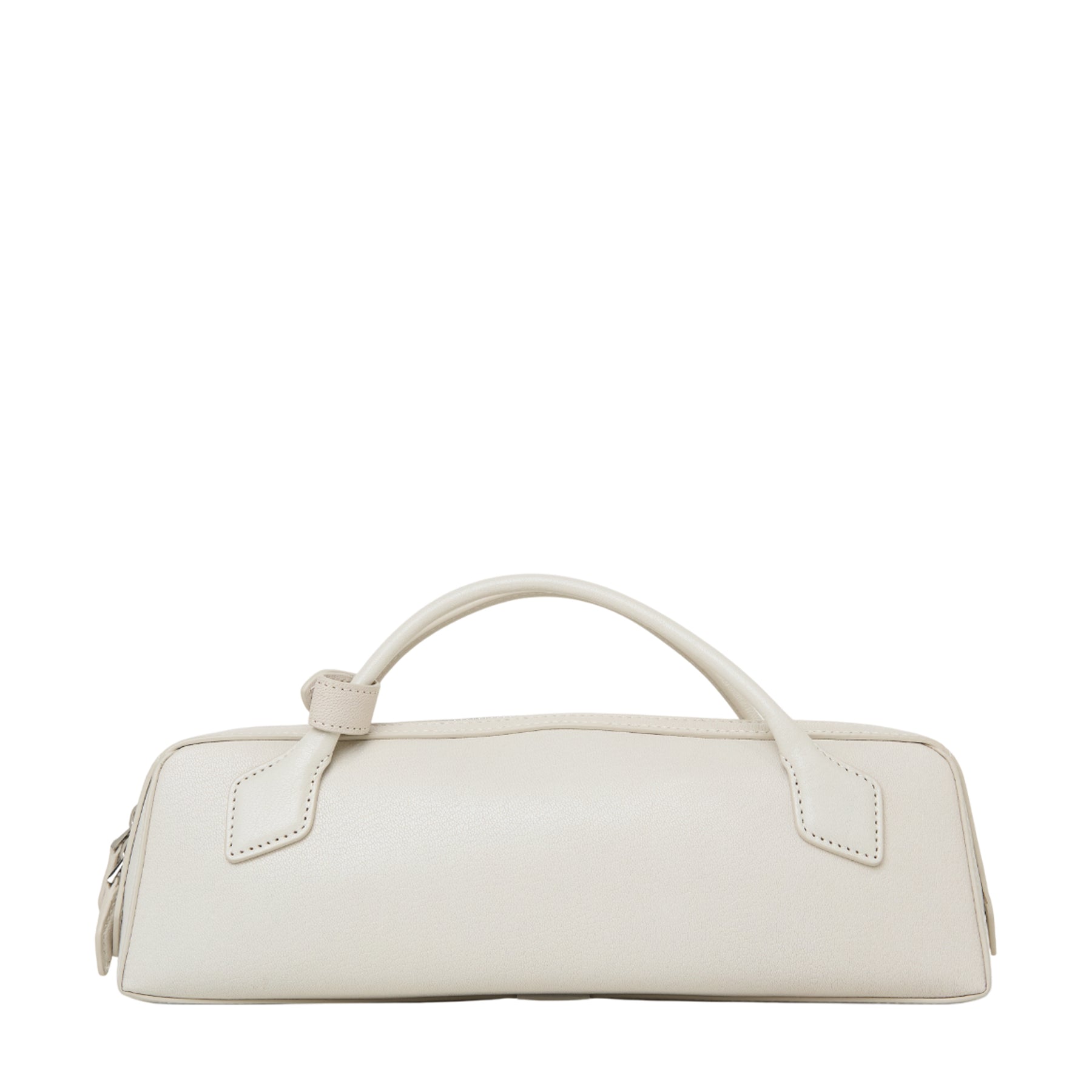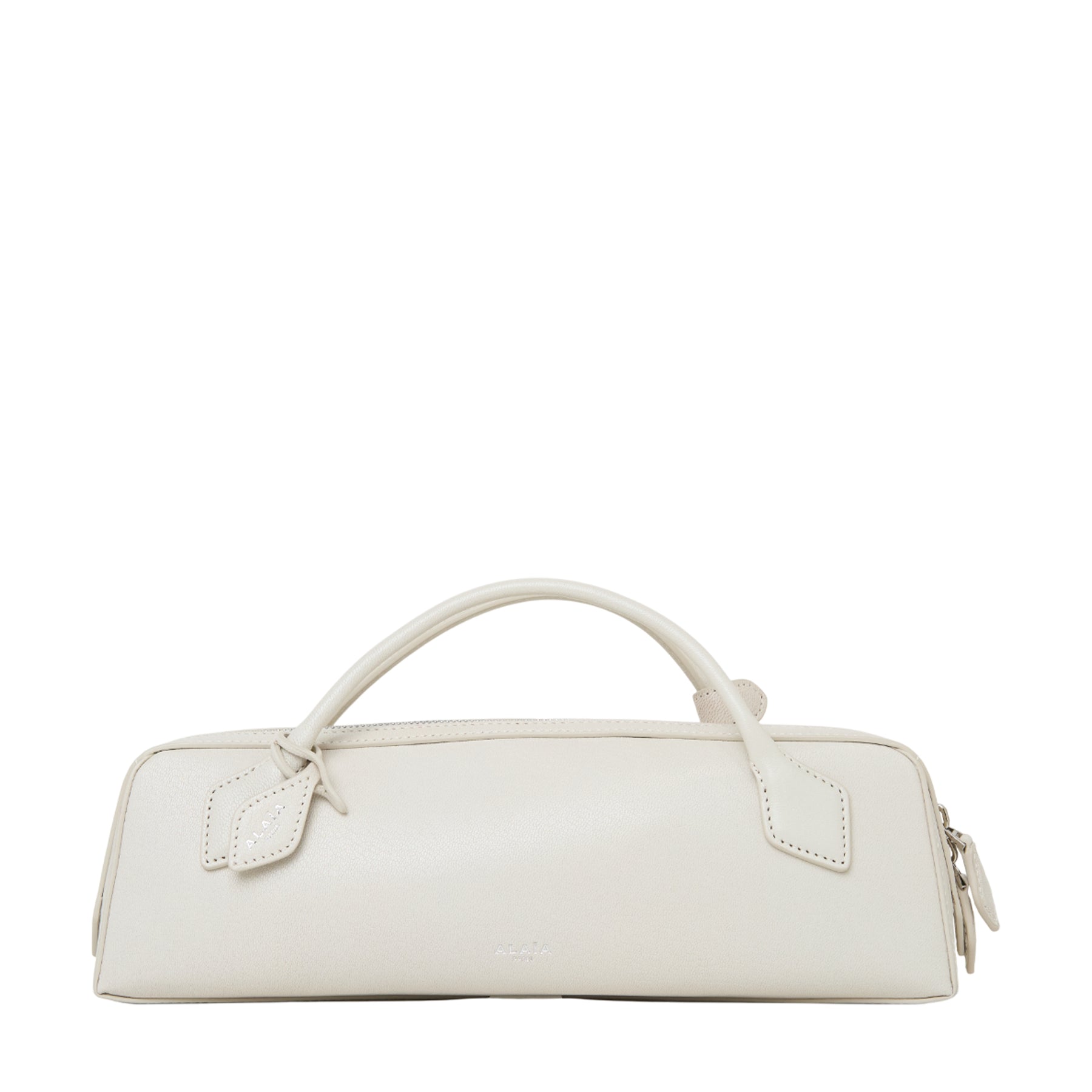 • Elongated shape, tubular short handles with decorative ties, double zip closure, small removable mirror on the inside pocket