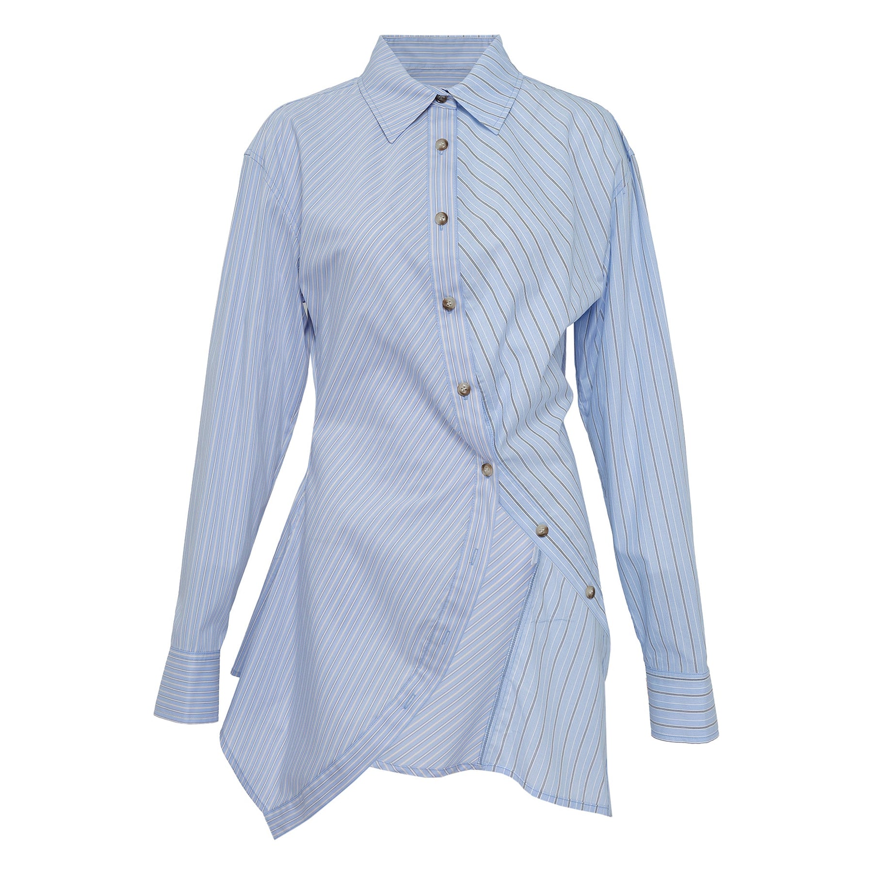 • Diagonal button closure and uneven hemline for a deconstructed finish