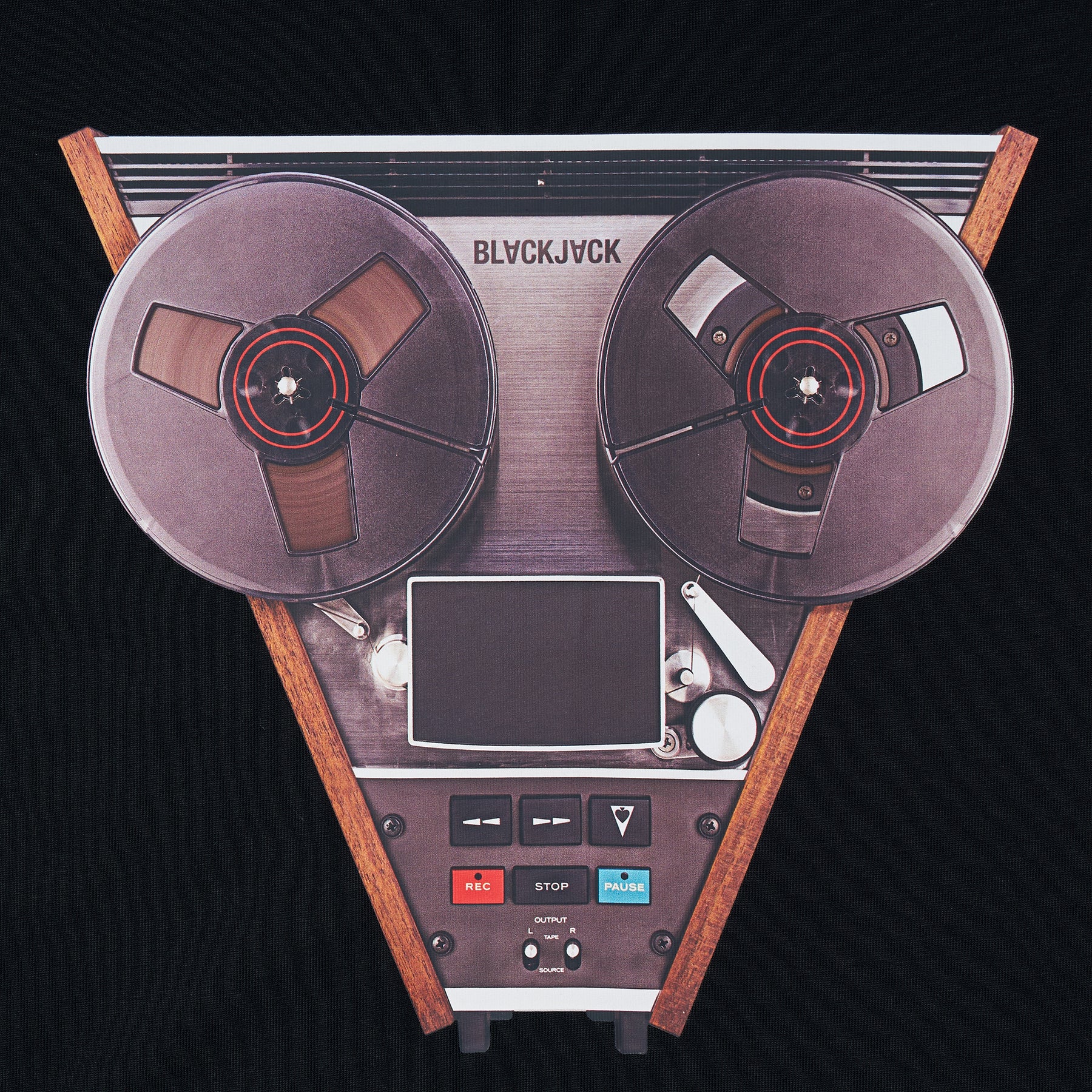 The Blackjack Recorder Tee delivers contemporary streetwear with vintage audio equipment graphics. Crafted from premium cotton in classic black, featuring an oversized reel-to-reel tape recorder print with brand typography. The relaxed fit and statement graphic create a bold piece for modern street style enthusiasts.