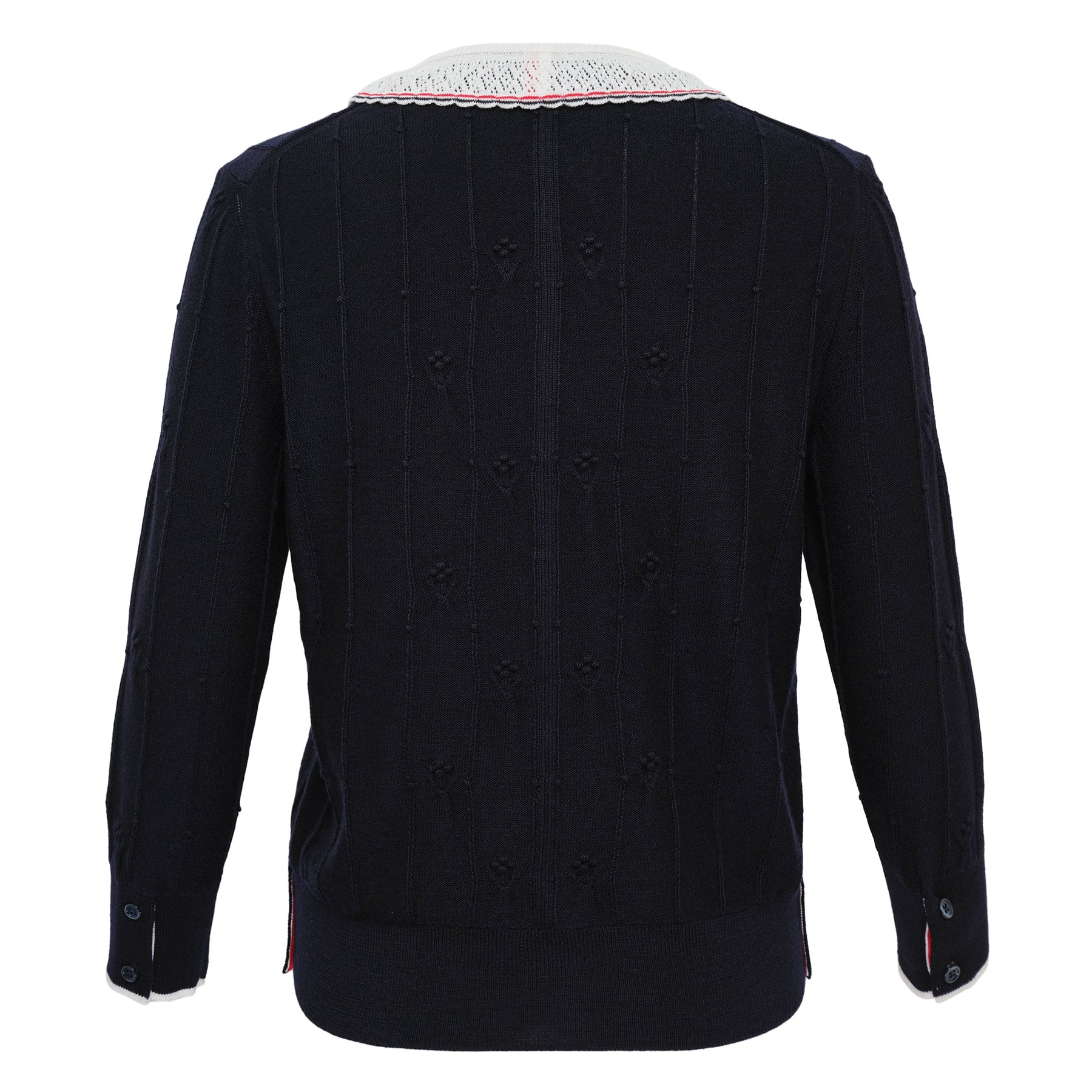 Thom Browne Bobble Stitch 3/4 Sleeve Knit Cardigan delivers preppy sophistication with signature textural craftsmanship and collegiate charm. Made from premium knitted cotton featuring distinctive bobble stitch construction and contrasting white collar with red and navy trim details. The classic button-front closure and tailored fit embody Thom Browne's refined American aesthetic.