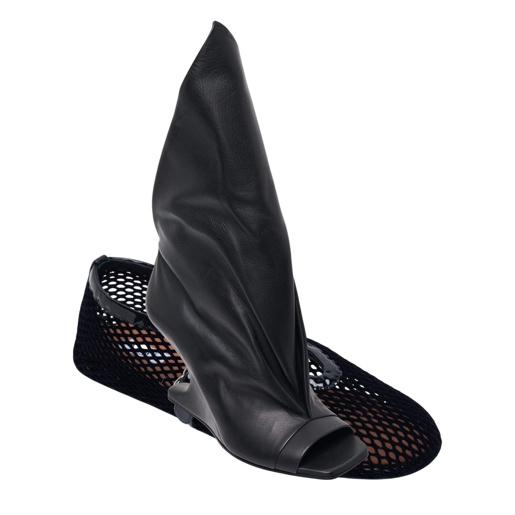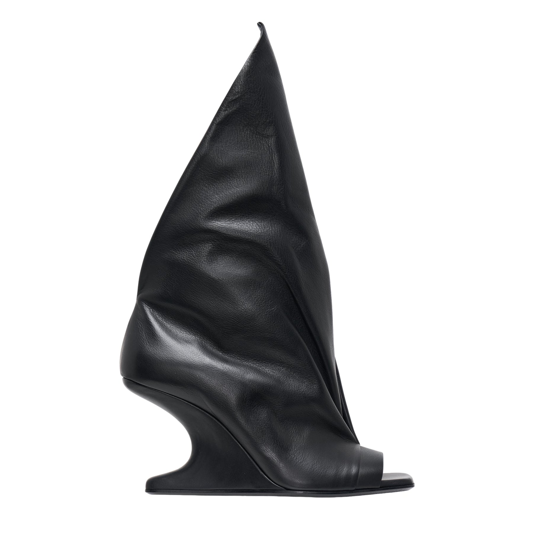 Rick Owens Cantilever 8 Strutter Sandal delivers avant-garde luxury with architectural construction and dramatic sculptural silhouette. Crafted from premium black leather with signature cantilever wedge heel, featuring open-toe design and distinctive curved construction. The innovative heel architecture and deconstructed aesthetic create a bold statement piece for contemporary wardrobes.