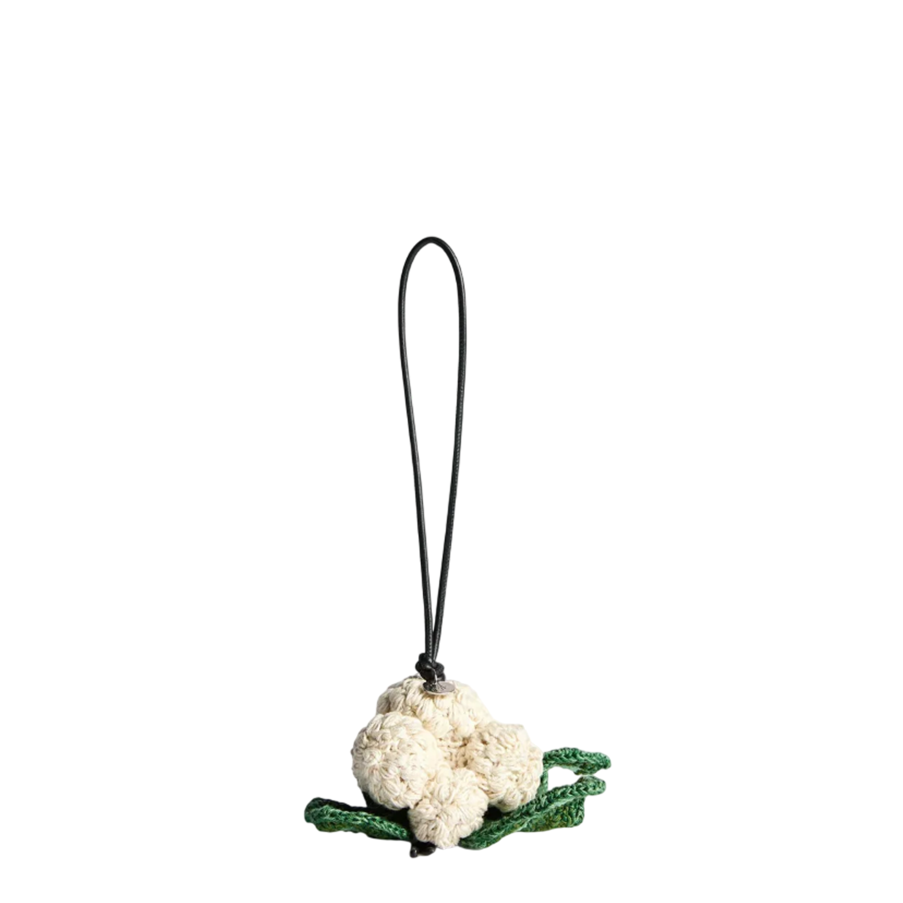JW Anderson Cauliflower Charm delivers whimsical luxury with handcrafted knitted construction and playful British design sensibility. Made from premium knitted yarn in cream with contrasting green leaves, featuring intricate crochet detailing that showcases artisanal craftsmanship. The signature charm design reflects Jonathan Anderson's distinctive approach to accessories that blur the lines between fashion and art.