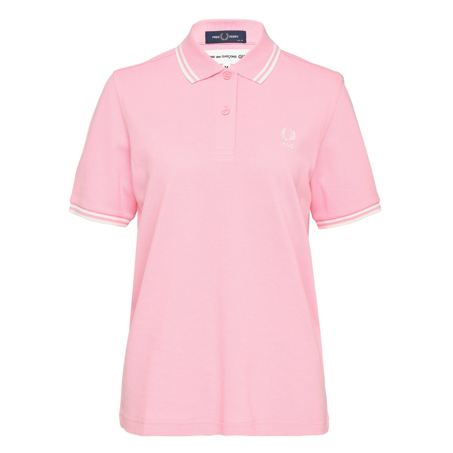 The COMME des GARCONS GIRL x Fred Perry Polo delivers avant-garde British heritage through collaborative design innovation. Crafted from premium cotton pique in soft pink with signature white tipped collar and cuff details. The iconic laurel wreath emblem meets CDG's experimental aesthetic for a unique fusion of classic polo styling.