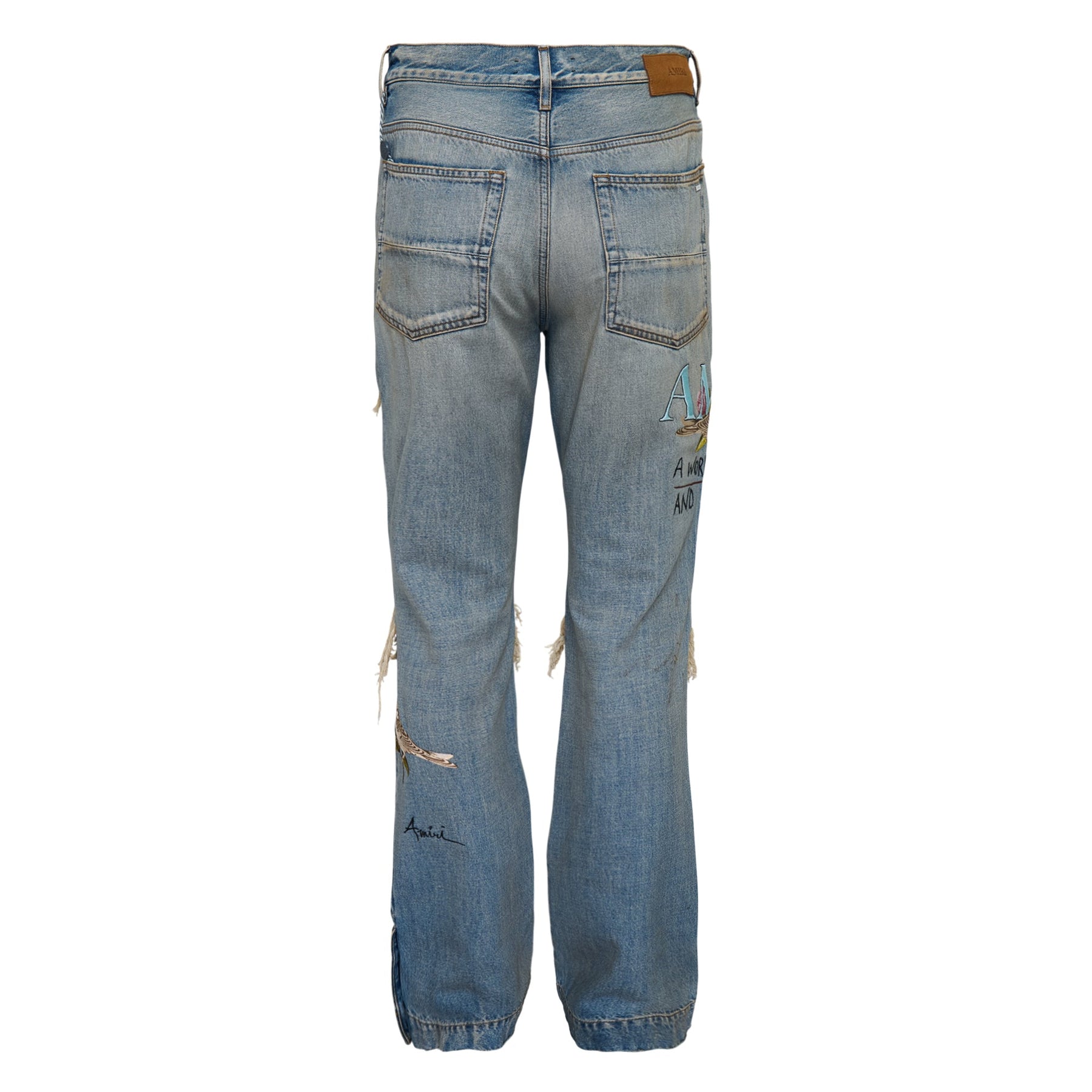 AMIRI CHATEAU MX1 Straight Flare delivers luxury streetwear with signature distressed detailing and contemporary silhouette. Crafted from premium denim with strategic rips, embroidered graphics, and exposed rope detailing throughout the legs. The straight-to-flare cut and hand-finished distressing create an authentic vintage aesthetic with modern luxury construction.