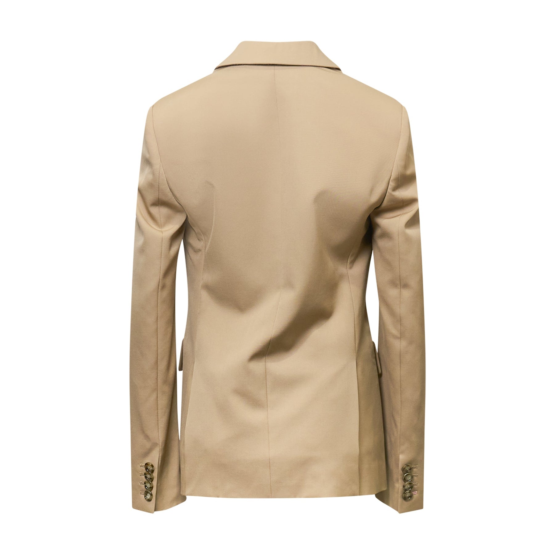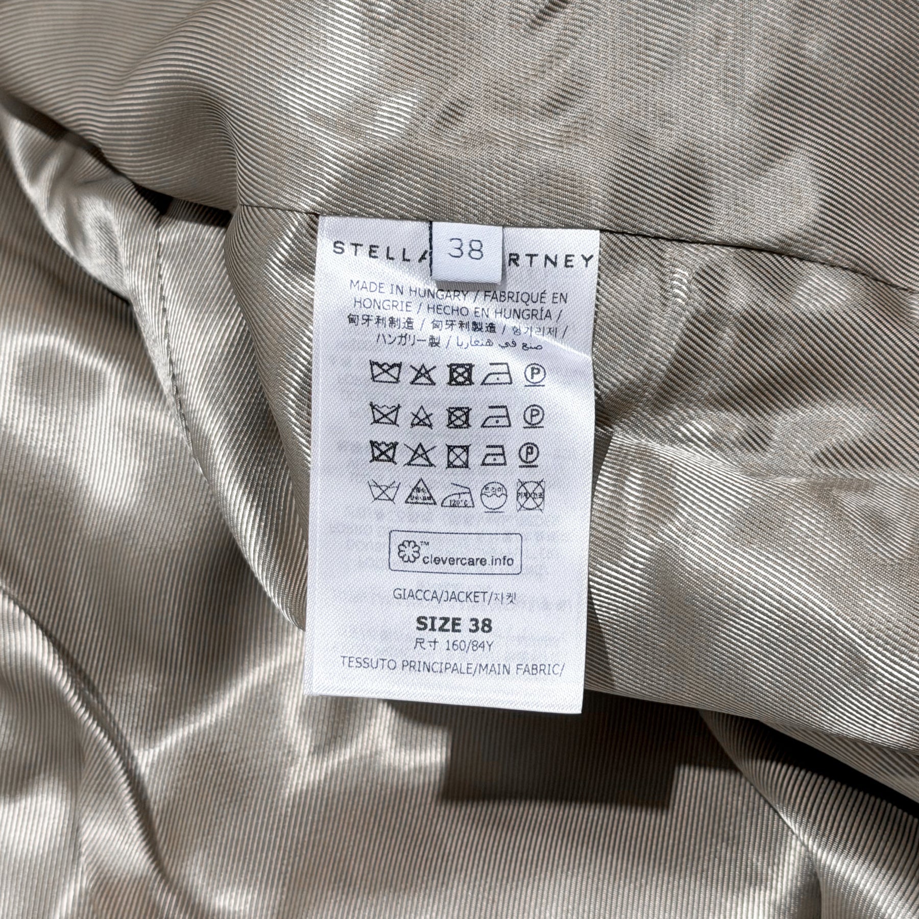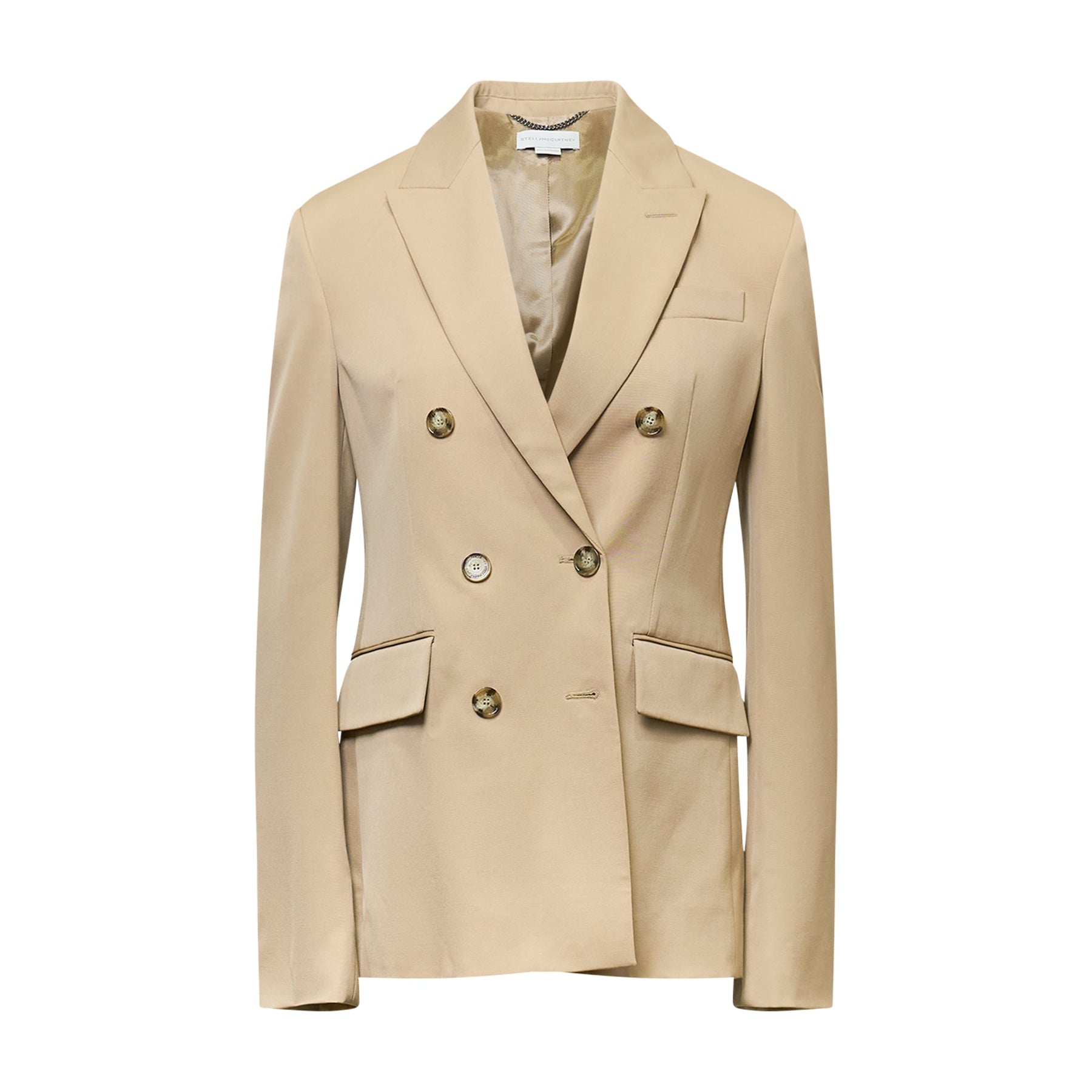 Stella McCartney Double Breasted Slim Jacket delivers sophisticated tailoring with contemporary feminine silhouette and structured construction. Crafted from premium beige wool blend with peak lapels and gold-tone button hardware throughout. The classic double-breasted design and tailored fit create a timeless wardrobe staple with modern luxury appeal.