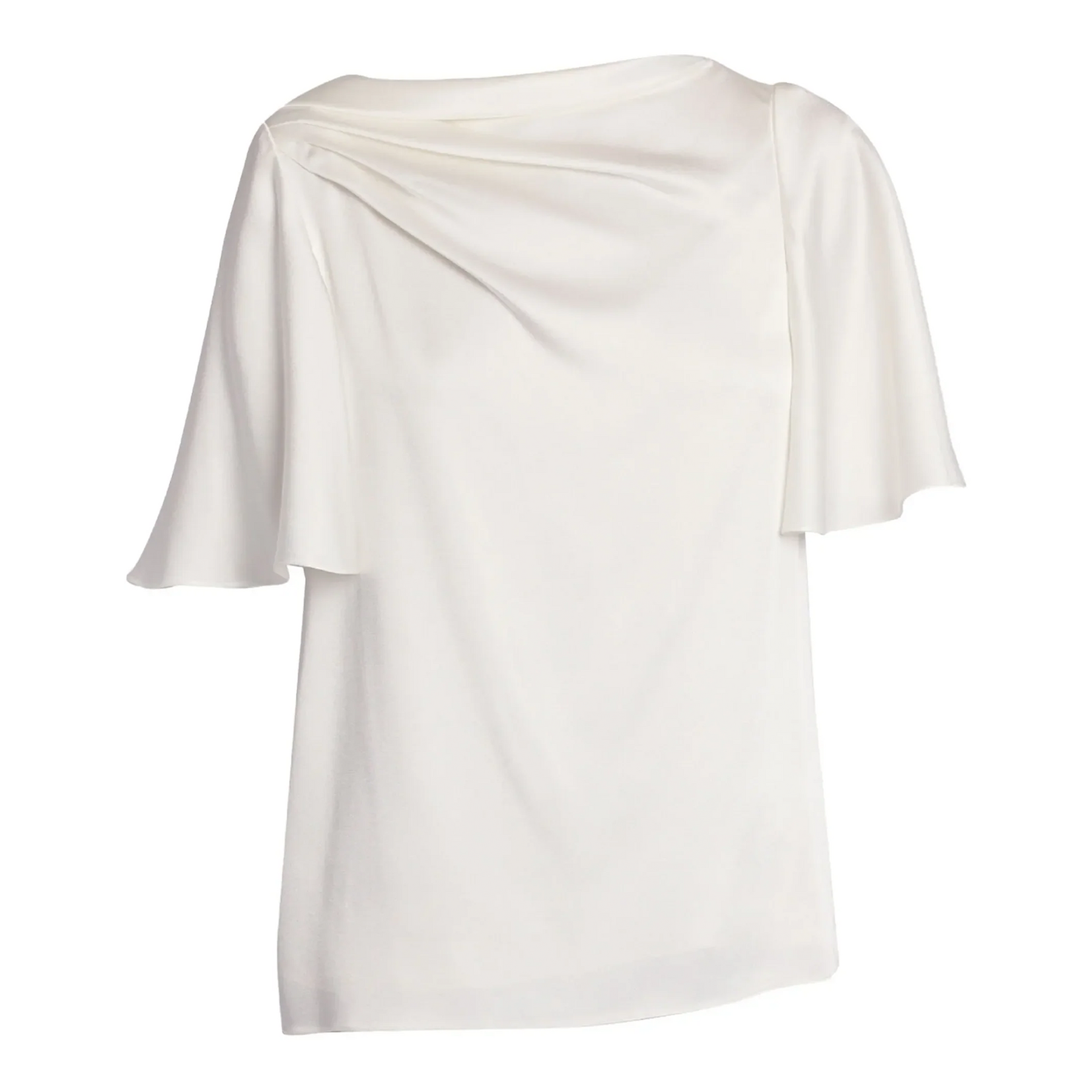 Draped from satin cady, this white top has an asymmetric, slash neckline and fluted sleeves. It is lined in silk.