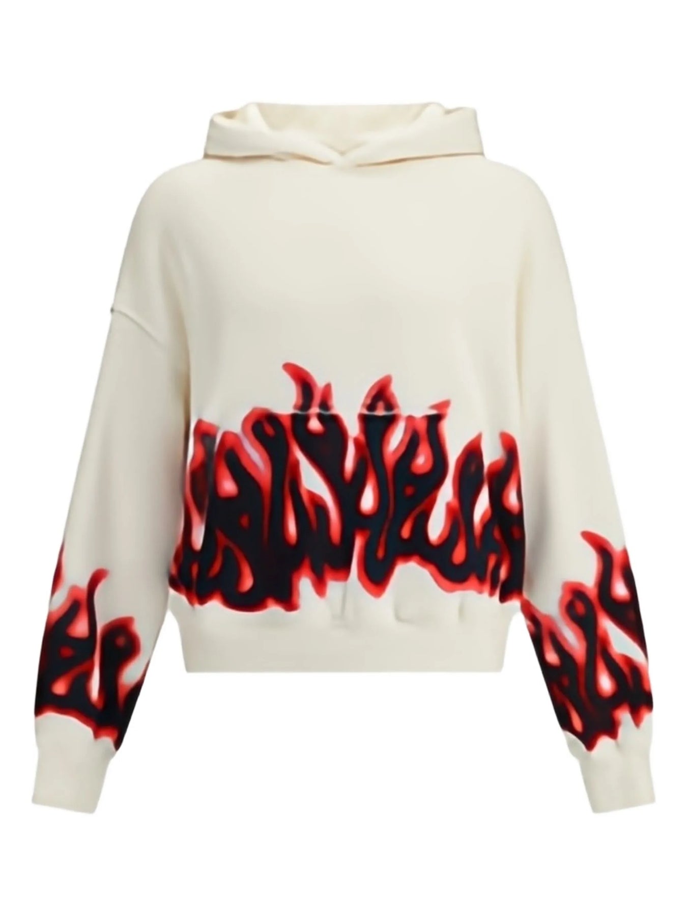 Palm Angels Flames Loose Hoodie delivers bold streetwear attitude with signature flame graphics and oversized comfort. Crafted from premium heavyweight cotton fleece in cream with striking red and black flame motifs across the chest and sleeves. The loose-fit silhouette and iconic Palm Angels aesthetic create a statement piece for contemporary street style.