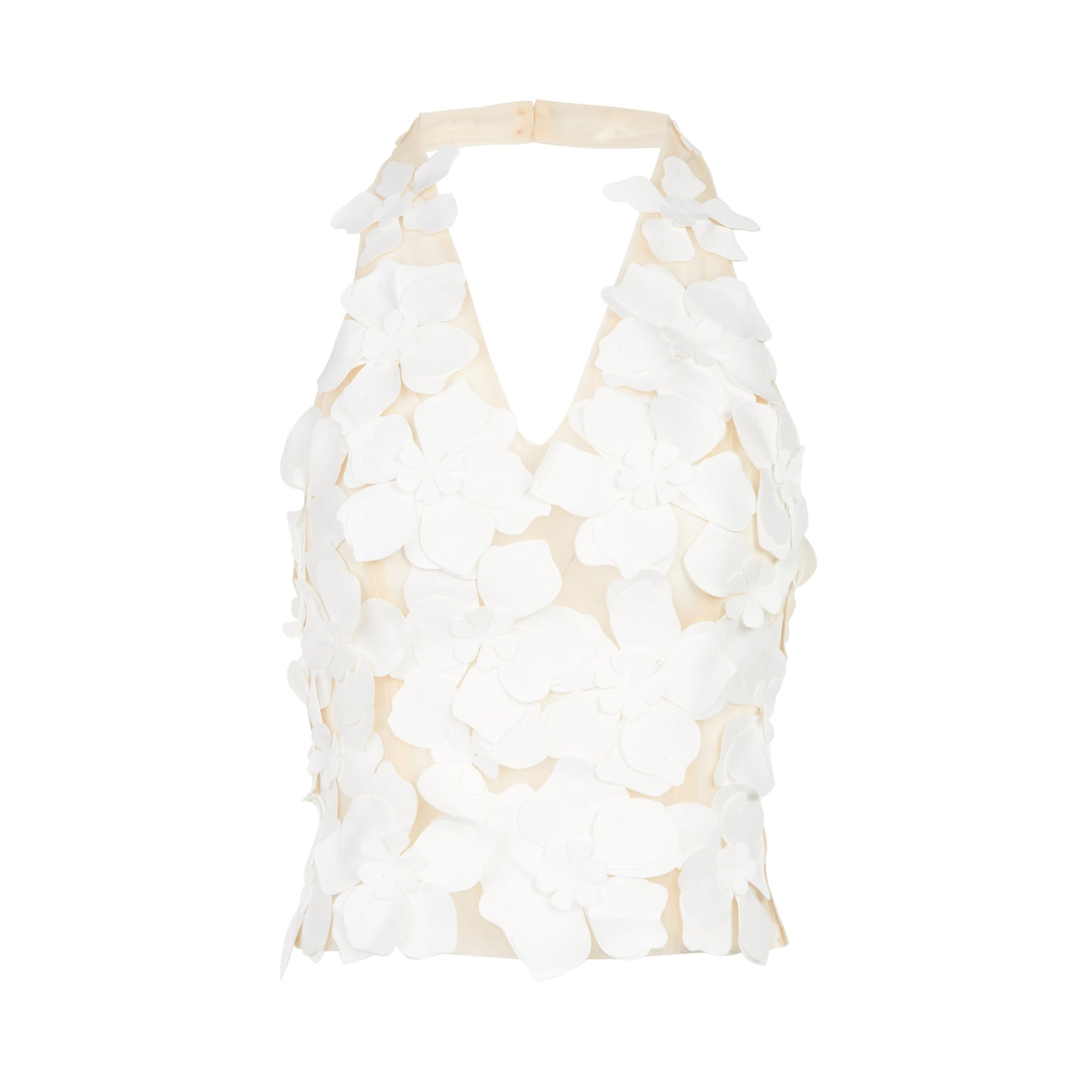 The Kenzie Klambie Floral Top delivers feminine elegance with contemporary halter styling and sophisticated appeal. Crafted from delicate fabric featuring layered petal appliqués in soft cream tones, creating dimensional texture and romantic movement. The halter neckline and tiered ruffle construction showcase the brand's signature attention to detail and refined craftsmanship.