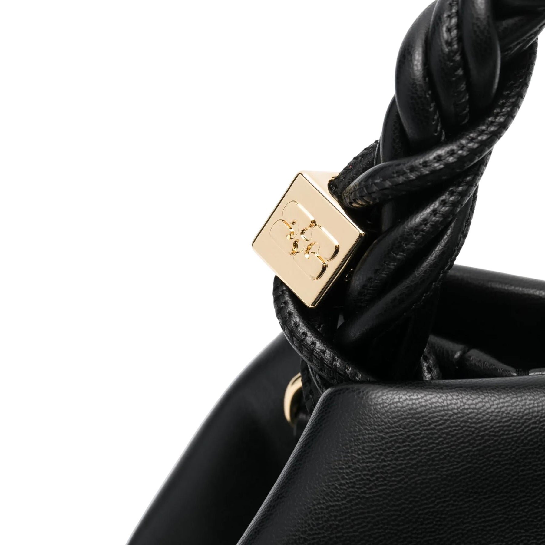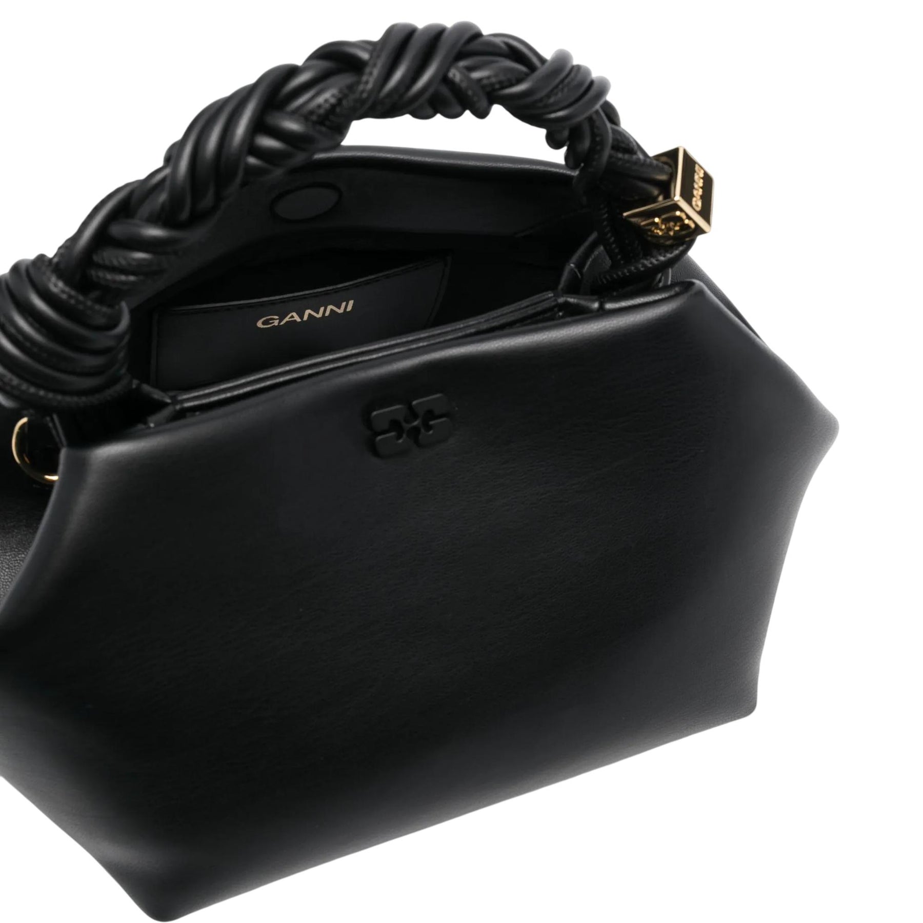 This bag features a tone-on-tone metallic GANNI Butterfly logo, a twisted handle with a braided knot, and a gold-tone metallic dice with a GANNI Butterfly logo engraved. The bag has an internal magnetic closure, a flat card pocket inside, and an adjustable and removable shoulder strap for crossbody wear.