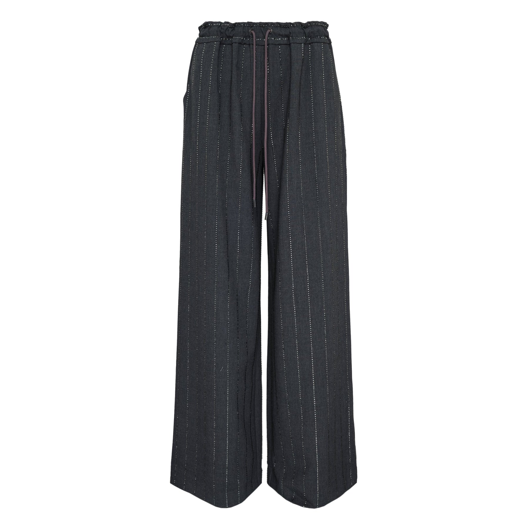 Self-Portrait Grey Rhinestone Pinstripe Trousers deliver contemporary elegance with sparkling embellishment details. Crafted from structured suiting fabric in charcoal grey, featuring vertical rhinestone pinstripes and a relaxed wide-leg silhouette. The paperbag waistband with drawstring creates a flattering high-waisted profile that defines the signature Self-Portrait aesthetic.