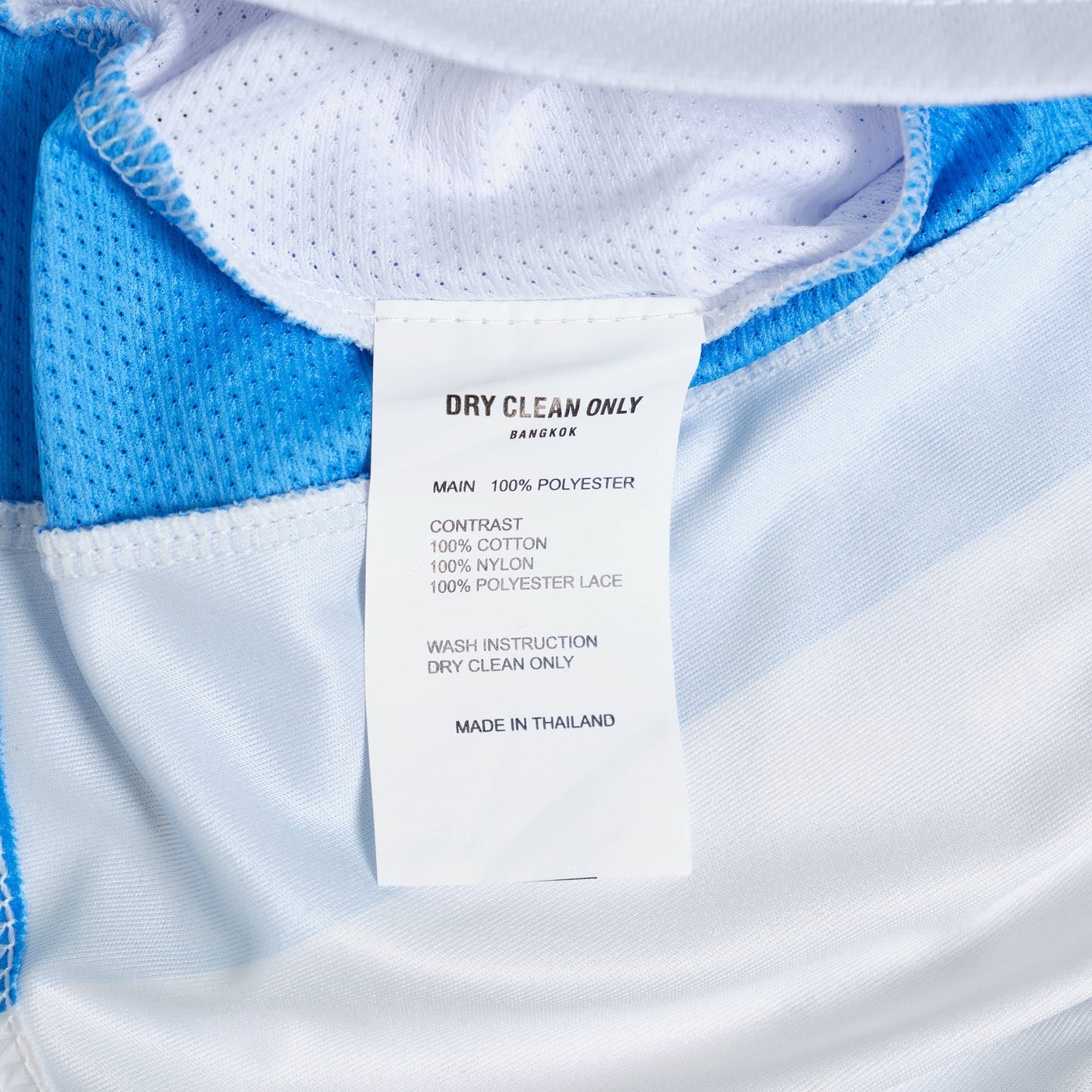 The DRY CLEAN ONLY Hello Kitty Stripes Jersey delivers playful streetwear with premium athletic construction and iconic character design. Crafted from performance polyester in blue and white colorblock stripes, featuring an oversized Hello Kitty appliqué across the chest. The Manchester United-inspired design creates a unique fusion of sports heritage and pop culture aesthetics.