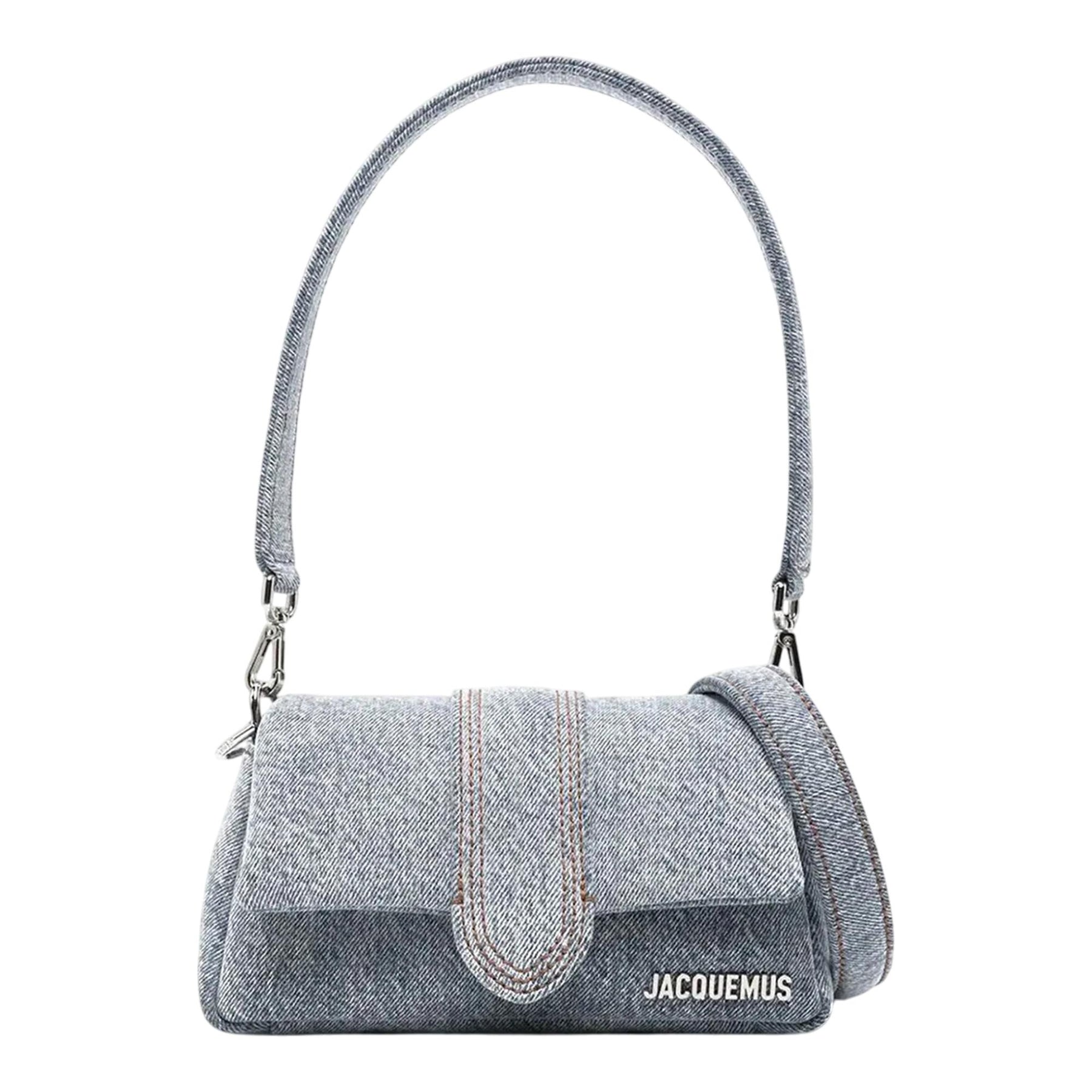 The Le petit Bambimou denim presents a plumped-up version of its signature structural shape, boasting the same structural shape as its Le Bambino prototype but with a padded twist. Crafted from light-wash denim, this handbag features both a detachable top handle and shoulder strap for versatile carrying options.