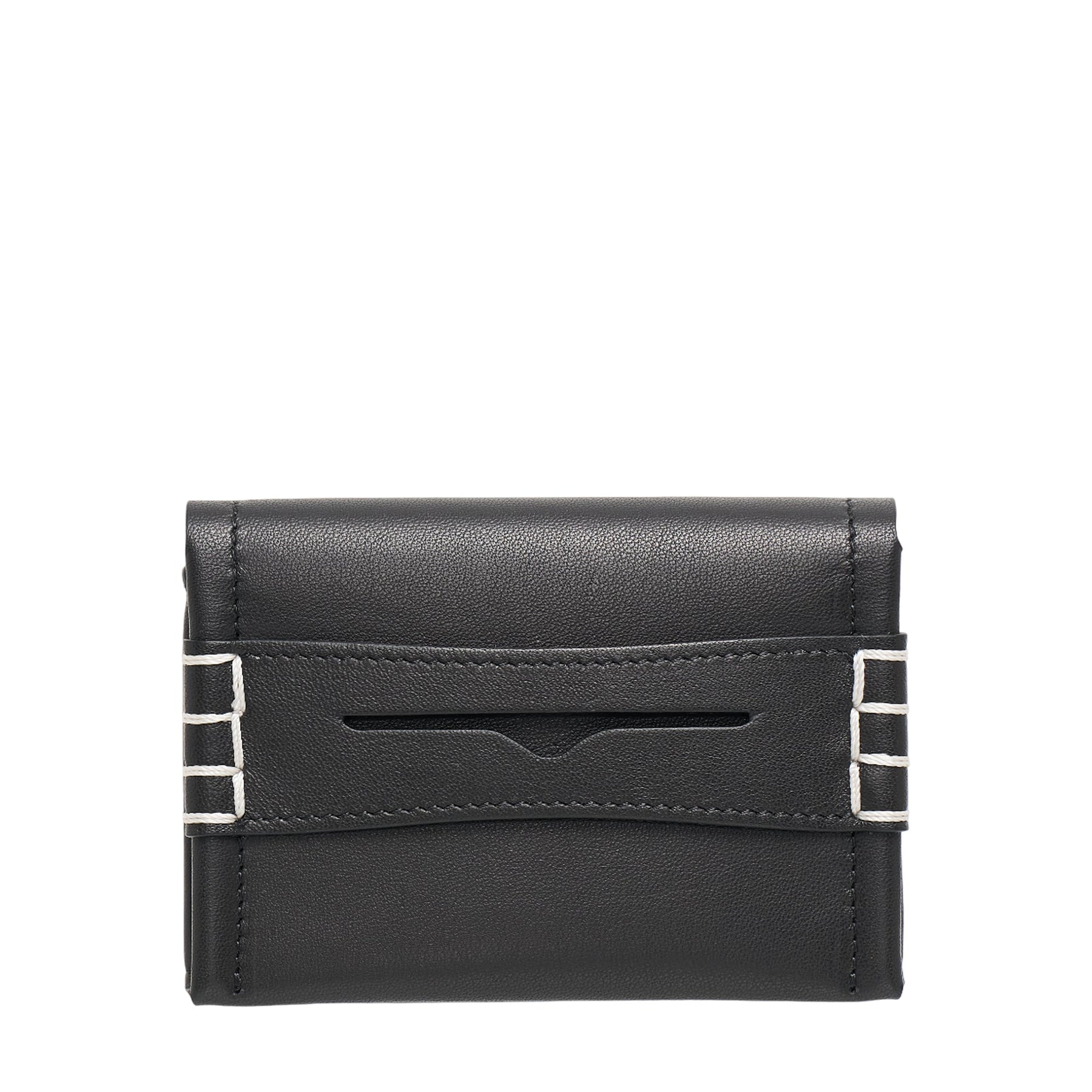 The JW Anderson Loafer Folding Card Holder delivers compact luxury with architectural design and premium functionality. Crafted from smooth black leather with contrast white stitching details and signature metal hardware accents throughout. The innovative folding construction maximizes card storage while maintaining a sleek, minimalist profile that reflects the brand's contemporary aesthetic.