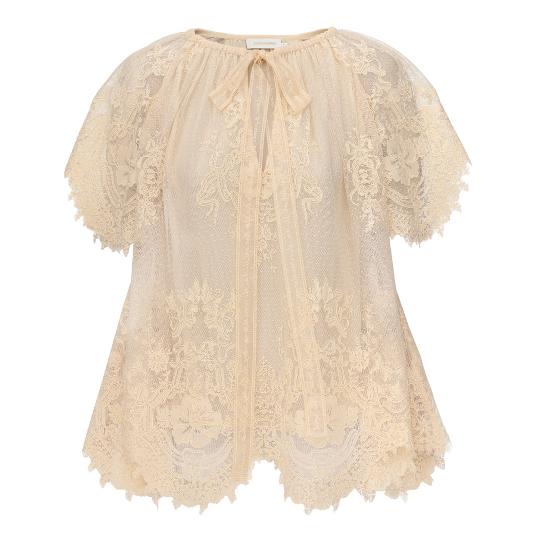 The ZIMMERMANN Luna Lace Flutter Blouse delivers romantic femininity with intricate lace craftsmanship and ethereal silhouette. Crafted from delicate floral lace in soft champagne, featuring dramatic flutter sleeves and scalloped edges throughout. The tie-neck detail and semi-sheer construction create ZIMMERMANN's signature bohemian elegance.