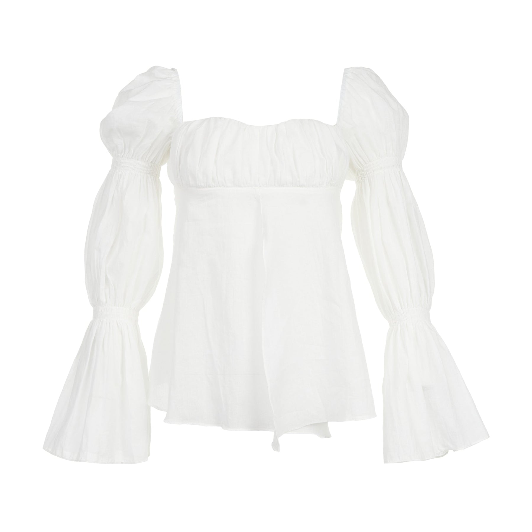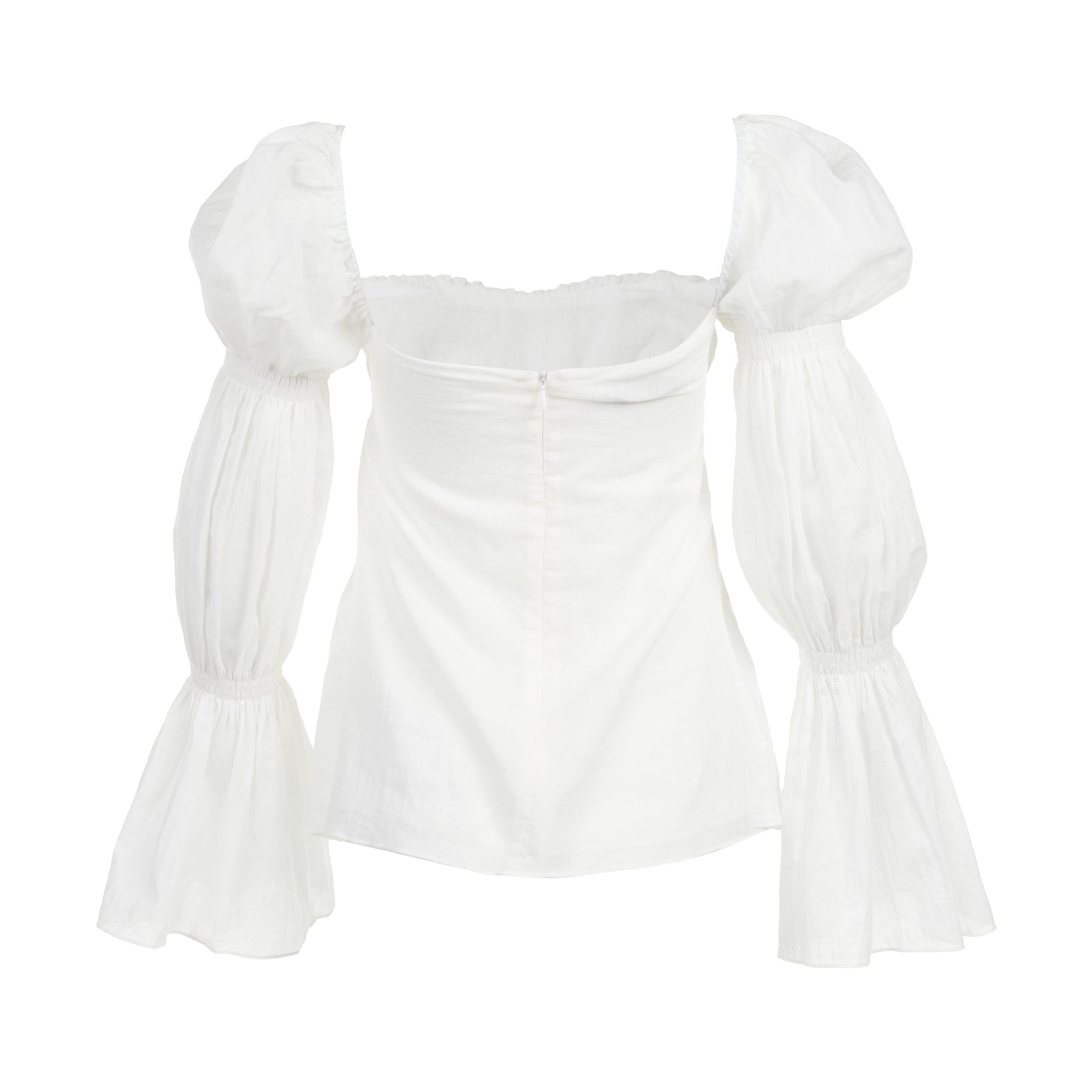 The Mitr Mali Blouse delivers romantic femininity with contemporary off-shoulder styling and dramatic volume. Crafted from lightweight cotton poplin in crisp white, featuring elasticated neckline and exaggerated puffed sleeves with gathered cuffs. The structured silhouette and oversized proportions create a statement piece that balances elegance with modern sophistication.