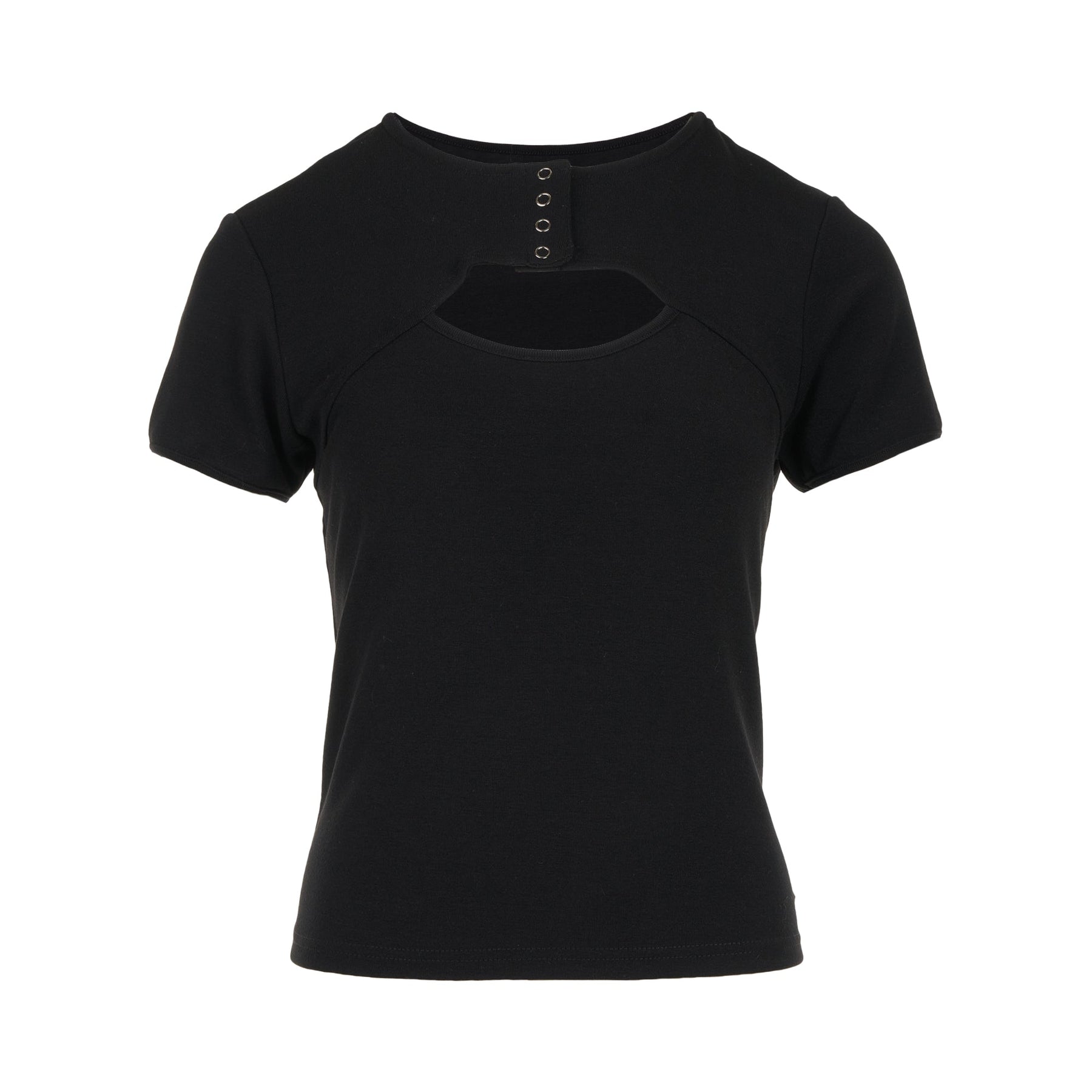 The I AM I AM Melrose Grommet T-Shirt delivers contemporary streetwear with distinctive metallic detailing and modern edge. Crafted from soft cotton jersey in classic black, featuring signature grommet hardware at the chest cutout for an industrial aesthetic. The structured silhouette and architectural design elements create a bold statement piece for urban wardrobes.