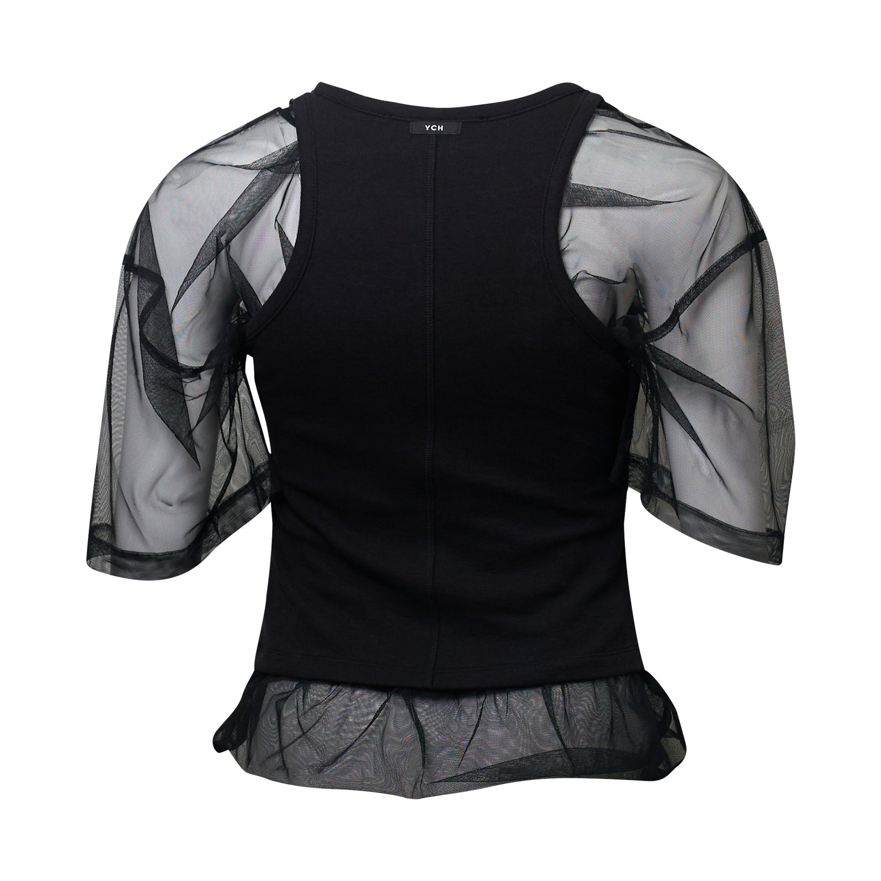 The YCH Mesh Layered Top delivers contemporary elegance with sheer mesh sleeves and structured layering. Crafted with a solid black bodice and delicate black mesh overlay featuring dramatic ruffle detailing at the hem. The halter-style neckline and short mesh sleeves create a sophisticated statement piece that balances coverage with modern transparency.
