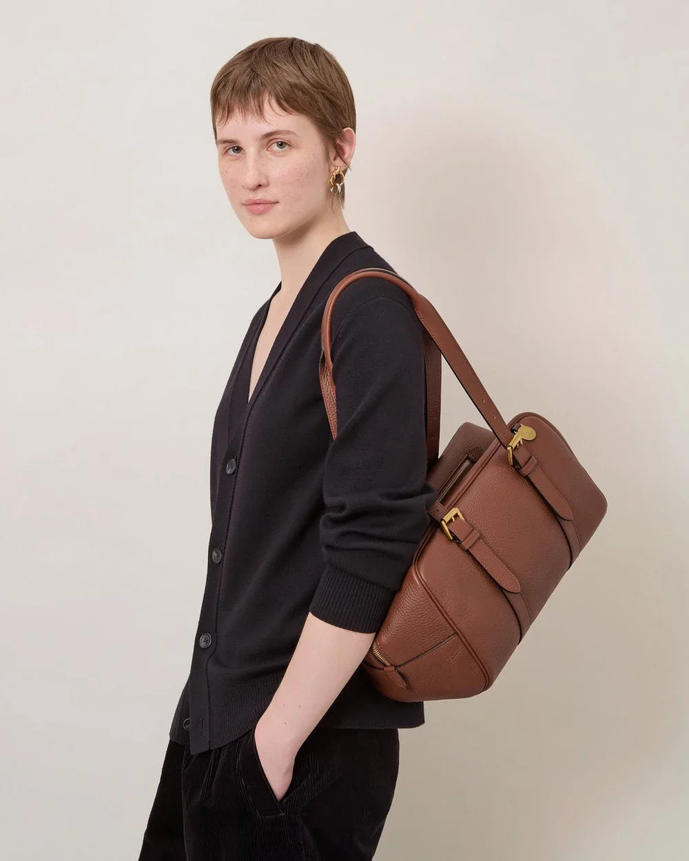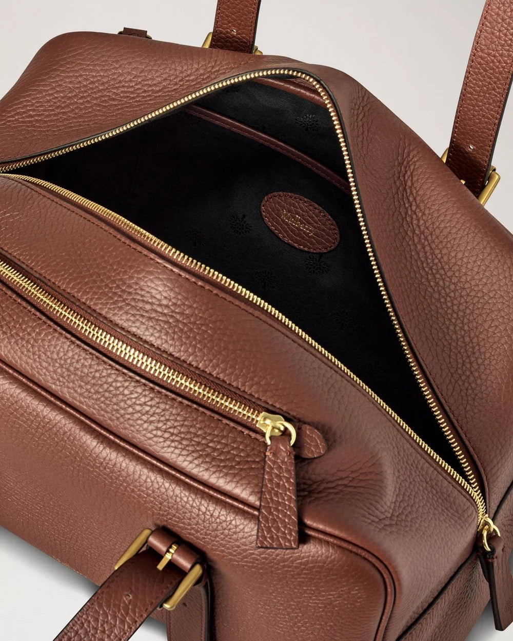 The Mulberry Boston Heavy Grain delivers timeless elegance with structured silhouette and premium leather construction. Crafted from signature heavy grain leather in rich cognac brown, featuring adjustable top handles with gold-tone hardware throughout. The spacious interior and iconic Boston shape create a sophisticated carryall for everyday luxury.