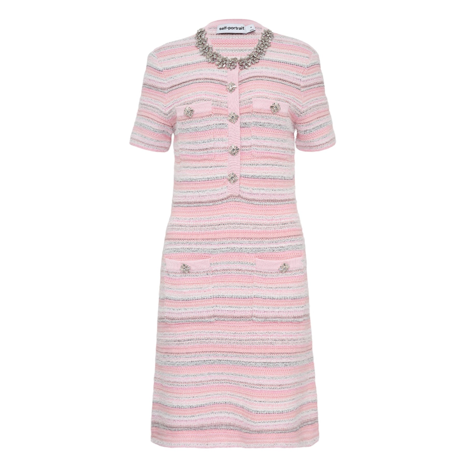 Self-Portrait Pink Textured Knit Mini Dress delivers contemporary femininity with signature embellished detailing. Crafted from premium textured knit fabric in soft pink with silver metallic threading, featuring crystal-embellished collar and decorative buttons. The structured mini silhouette and signature Self-Portrait craftsmanship create an elevated piece perfect for special occasions.