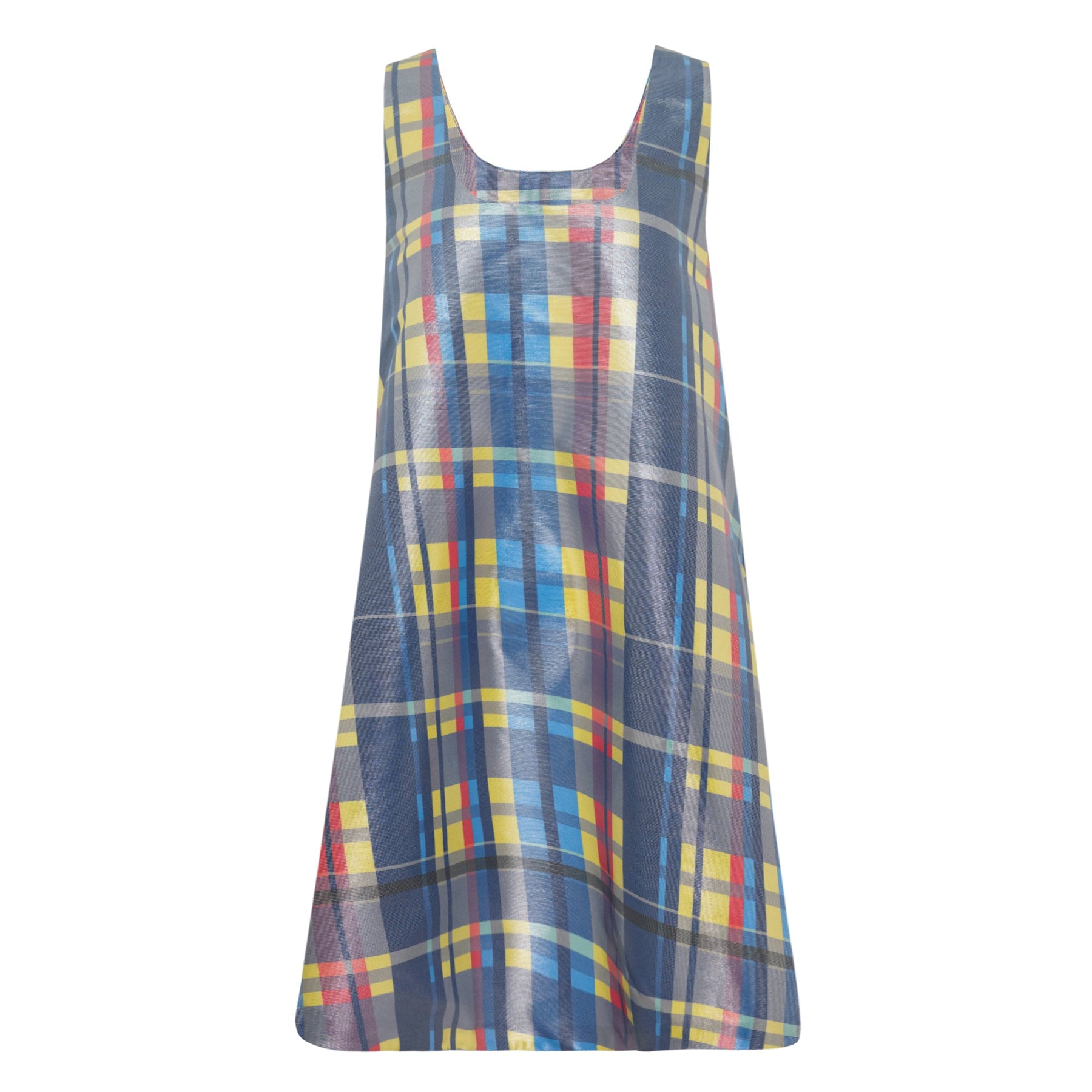 ENFOLD Plaid Mini Jumper Dress delivers contemporary Japanese minimalism with vibrant plaid patterning and relaxed silhouette. Crafted from lightweight cotton blend fabric in multicolored blue, yellow, and red check pattern, featuring a sleeveless design and A-line construction. The brand's signature modern approach to classic silhouettes creates an effortlessly chic piece for everyday sophistication.