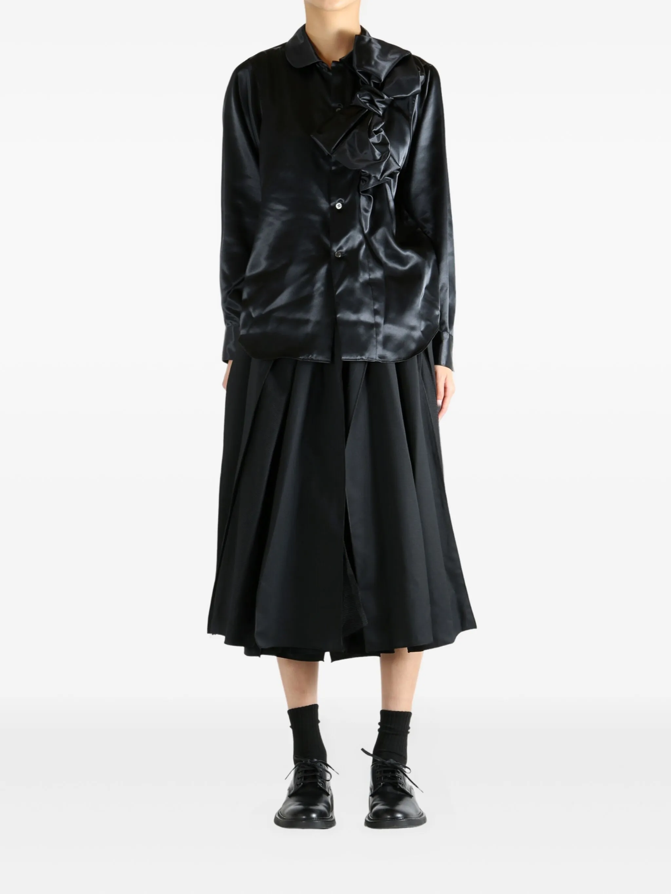 COMME des GARCONS Polyester Satin Shirt delivers avant-garde luxury with architectural construction and sophisticated craftsmanship. Made from premium polyester satin in rich black, featuring dramatic side ruffle detailing and structured silhouette. The brand's signature deconstructed aesthetic and asymmetrical design create a bold statement piece for contemporary wardrobes.