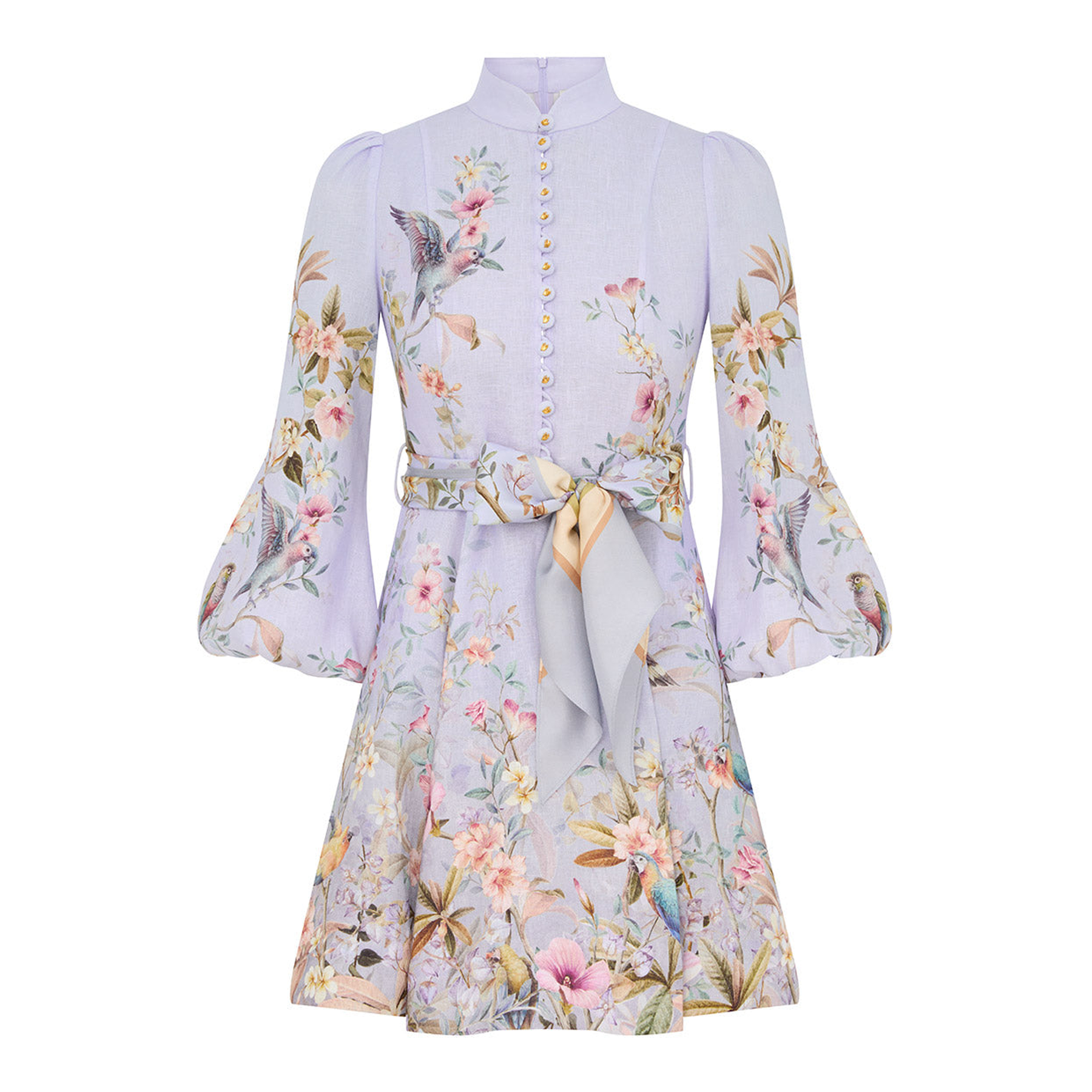 ZIMMERMANN Rebellion Button Mini Dress delivers feminine luxury with botanical-inspired artistry and romantic silhouette. Crafted from flowing silk-blend fabric in soft lavender base, featuring vibrant floral and bird motifs throughout. The high neckline with covered button closure and billowing sleeves create an enchanting bohemian aesthetic.