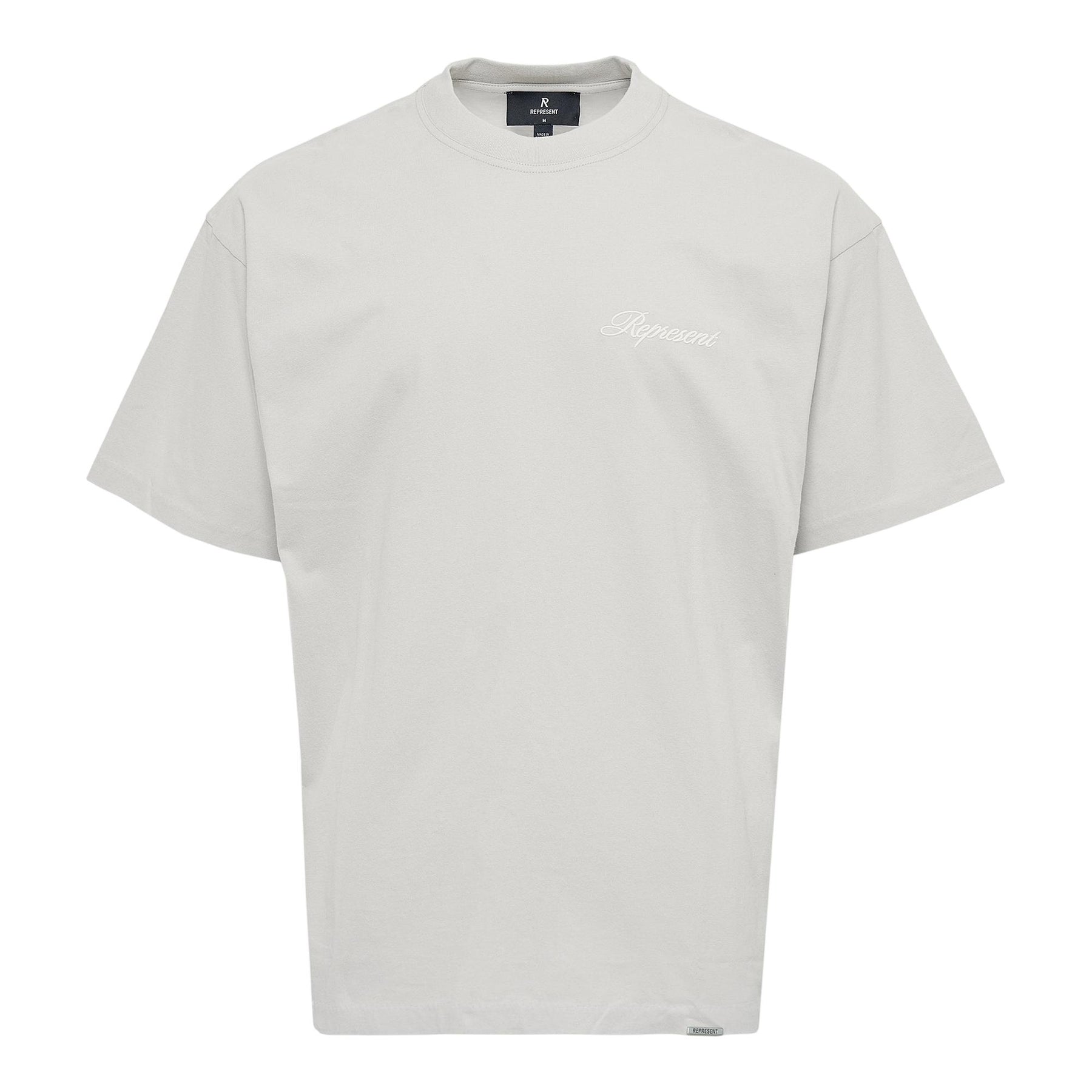 Introducing the Script Logo T-Shirt in Concrete, a slightly oversized t-shirt crafted from soft jersey cotton with a carbon finish for a smooth, premium feel. Featuring high-build embroidered script branding at the chest, the piece is finished with a clean blind hem and the signature Represent metal bar at the hem.