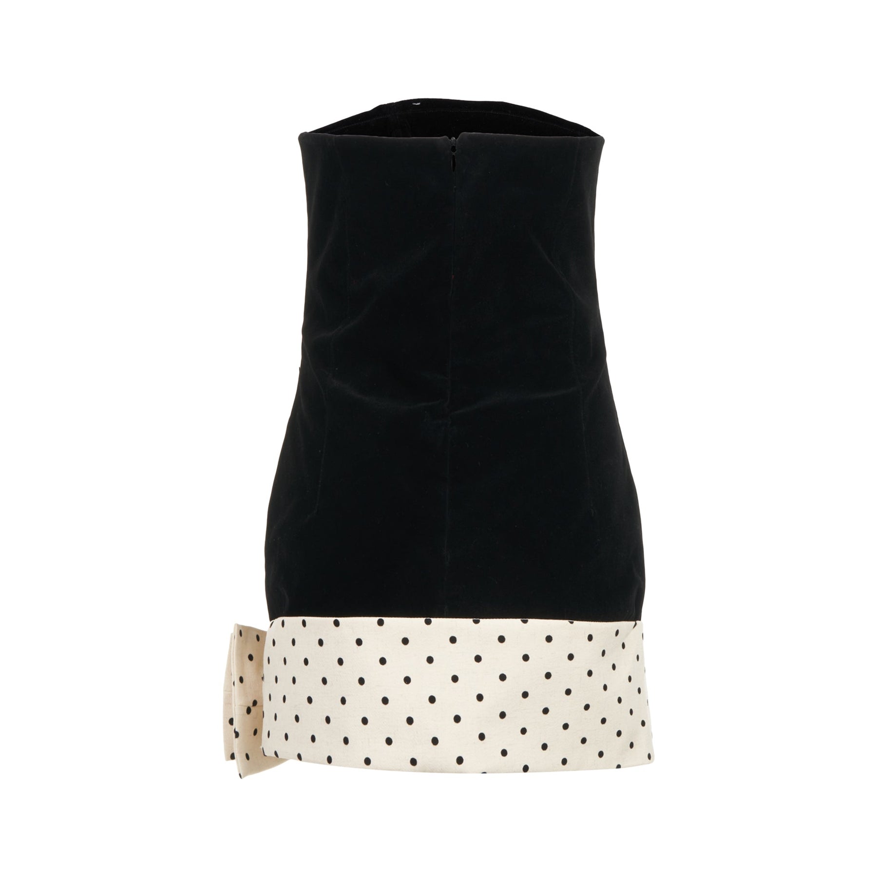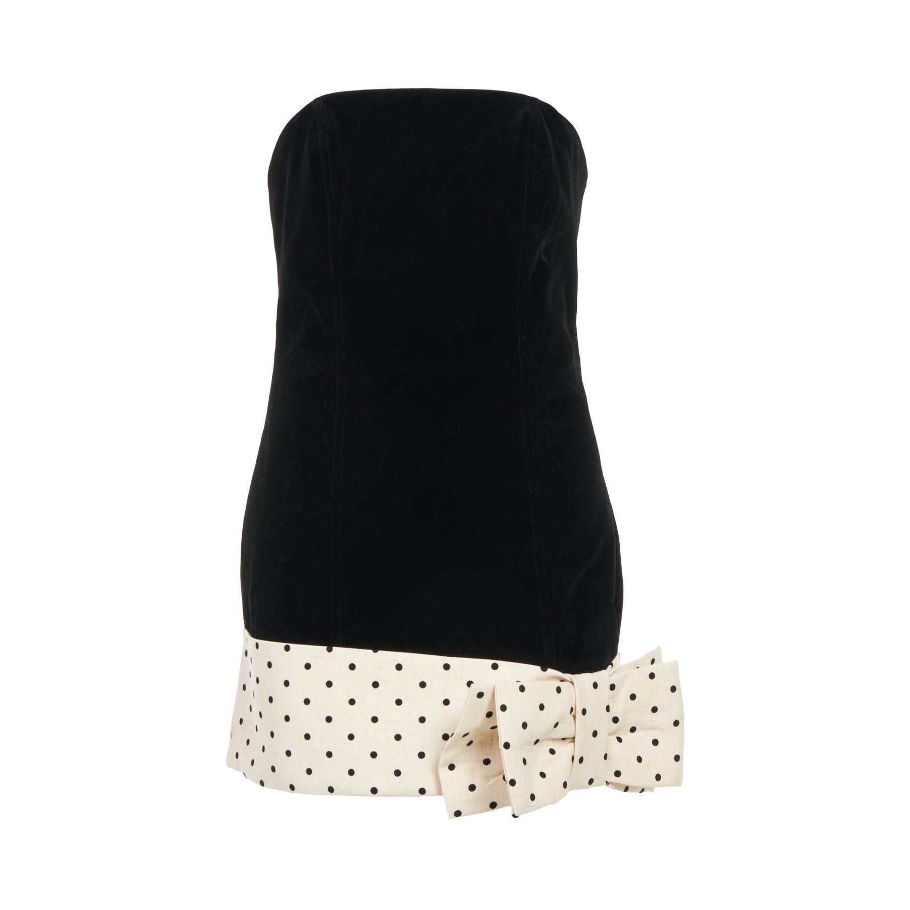 The Kenzie Klambie Ribbon Dress delivers sophisticated elegance with a distinctive strapless silhouette and contrasting bow detail. Crafted from smooth black fabric with a crisp white polka dot ribbon waistband, creating a striking monochromatic aesthetic. The tailored bodice and playful bow accent showcase the brand's signature feminine charm with contemporary edge.