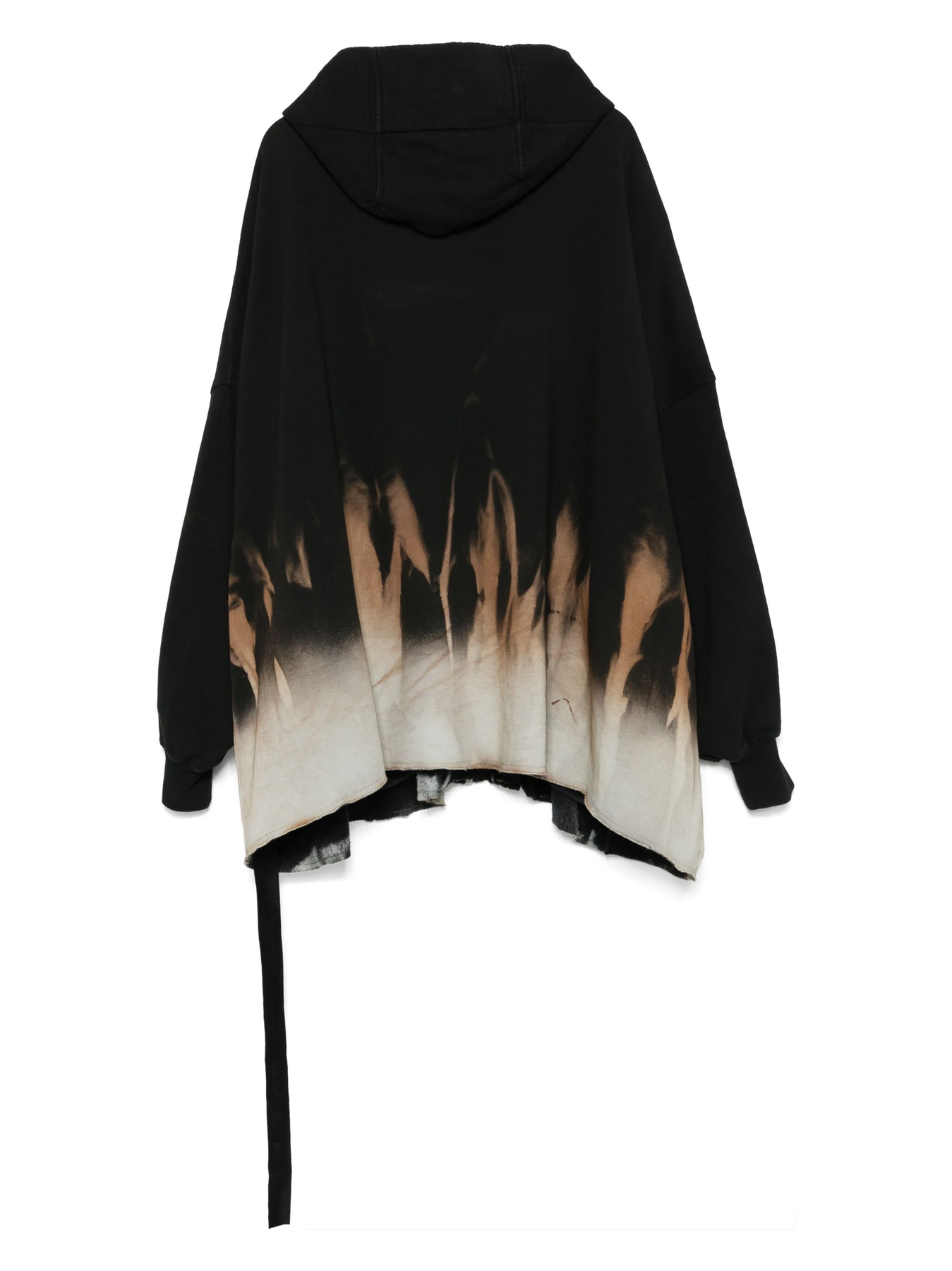 The JUMBO HOODED PETER JACKET hits below the hip in an oversized fit. This heavy cotton sweatshirt is garment-dyed black and goes through a two-step tie-dye and degradation process to create the sunburst pattern. The orange is sprayed all over to create the final look.
