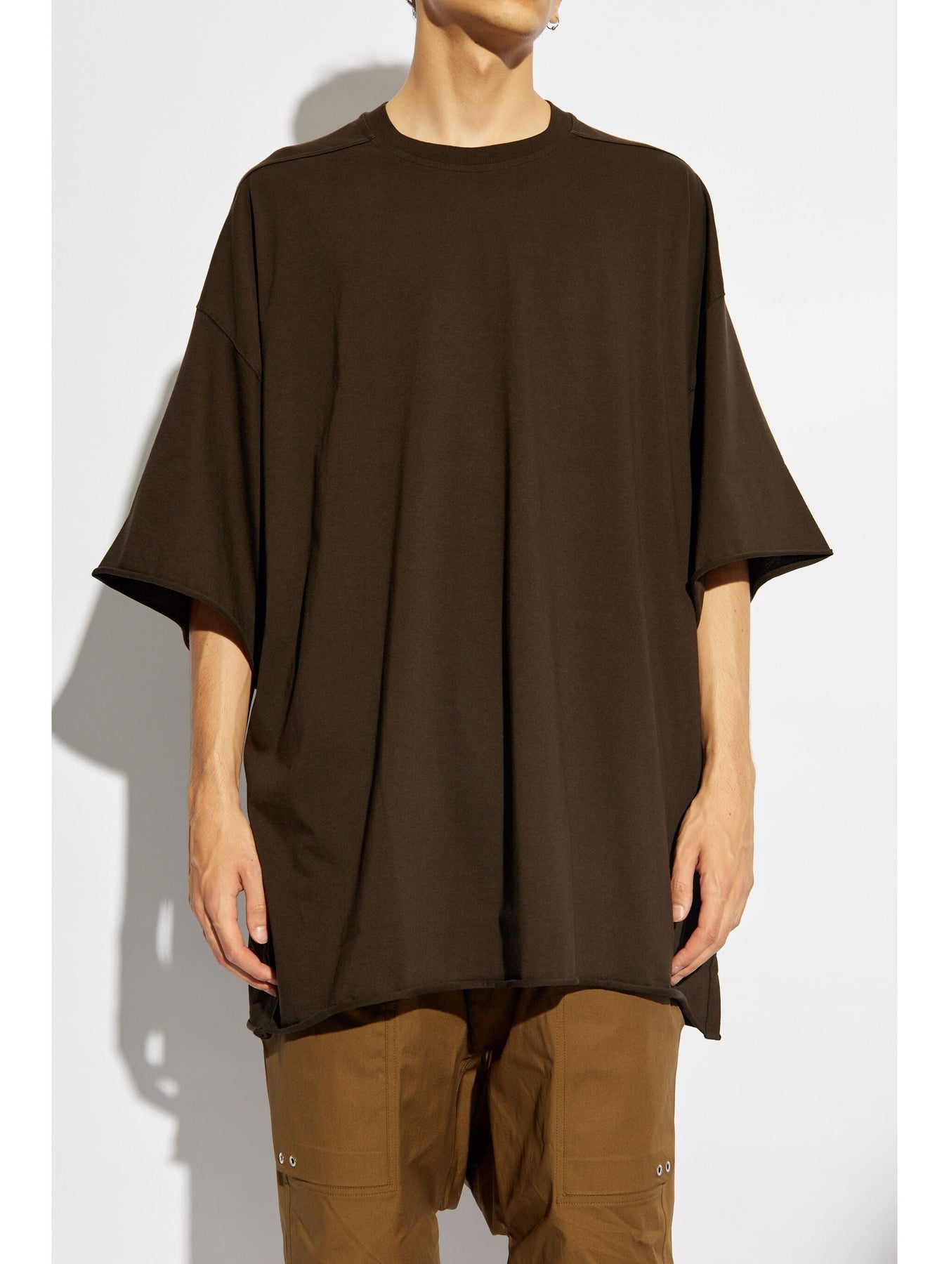 This TOMMY T-shirt hits below the hip in an oversized fit. It features wide sleeves with short cuffs, dropped armholes, a raw hem and a ribbed crew neck. It has signature flat front shoulder seams.