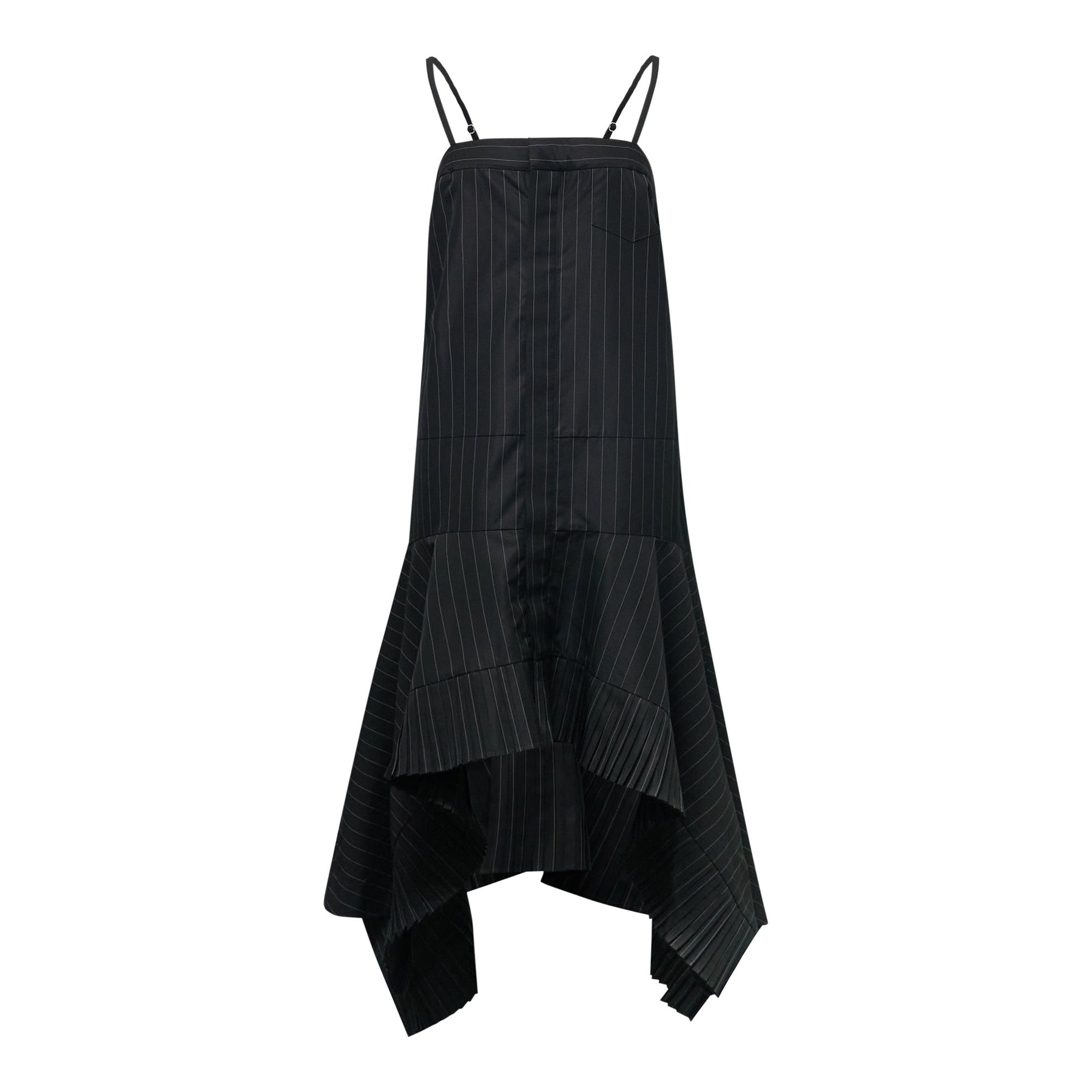 The sacai Chalk Stripe Dress delivers avant-garde femininity with architectural silhouette and asymmetrical construction. Crafted from premium pinstripe fabric in sophisticated black with white chalk stripes, featuring the brand's signature deconstructed hemline. The spaghetti strap design and dramatic handkerchief hem create a bold statement piece for contemporary wardrobes.
