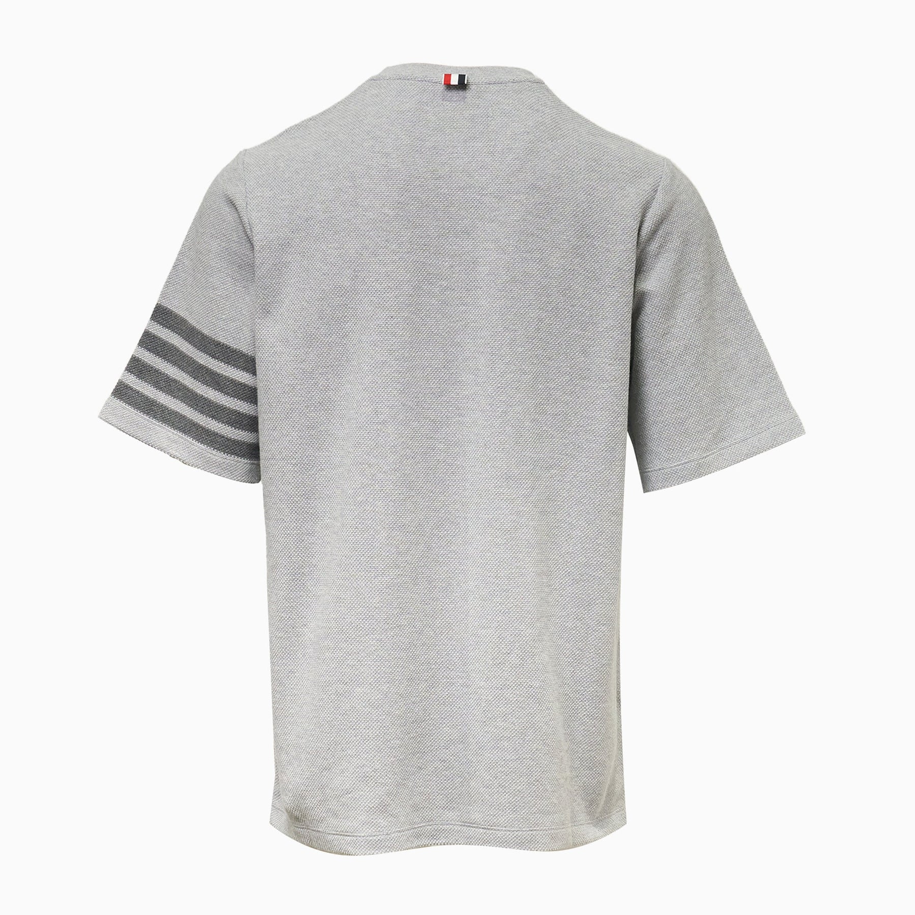 The Thom Browne Short Sleeve Textured Tee delivers sophisticated casualwear with the brand's signature athletic-inspired details. Crafted from premium textured pique cotton in classic light gray, featuring the iconic four-bar stripe detail on the sleeve. The structured silhouette and signature side tab construction elevate this essential tee with unmistakable Thom Browne DNA.