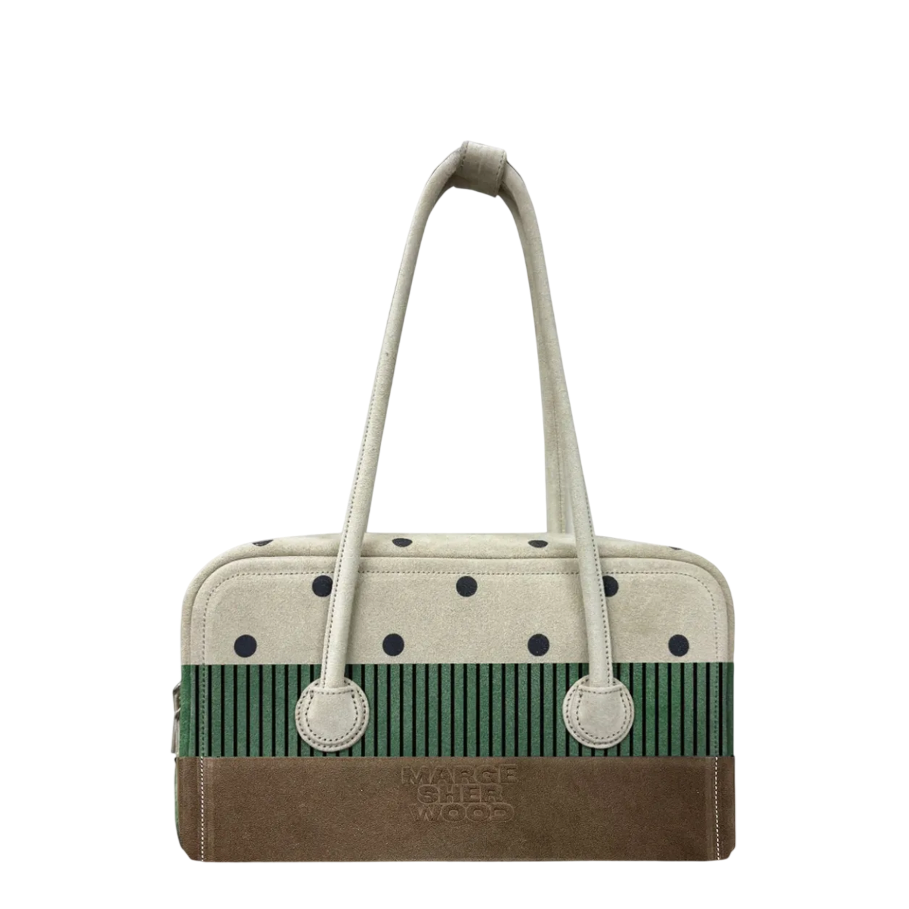 The MARGESHERWOOD Soft Boston Small delivers contemporary elegance with structured versatility for everyday use. Crafted from premium canvas in cream with polka dot detailing, featuring green striped accents and rich brown leather trim. The compact boston silhouette and dual handle design create a timeless piece that transitions seamlessly from day to evening.