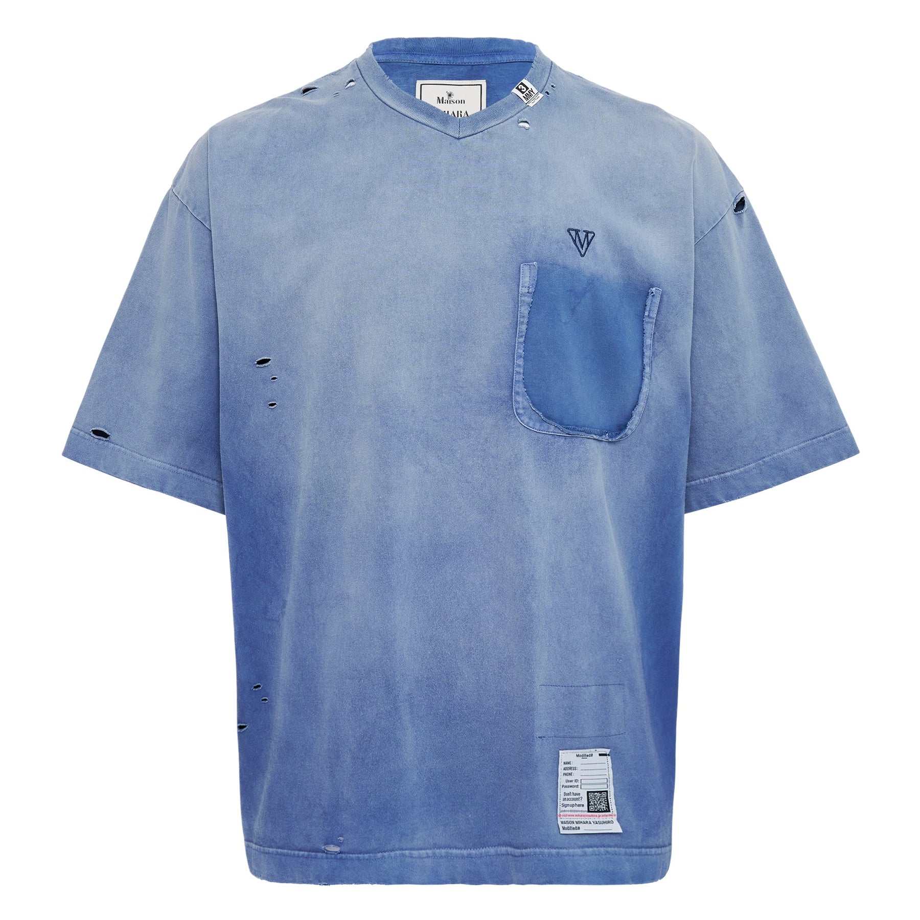MIHARA YASUHIRO Sun Faded V Neck Tee delivers avant-garde Japanese streetwear with vintage-inspired distressing and contemporary design. Crafted from premium cotton with gradient sun-fade wash treatment, featuring intentional distressed holes and raw edge details throughout. The oversized silhouette and chest pocket create a signature deconstructed aesthetic that defines modern streetwear.