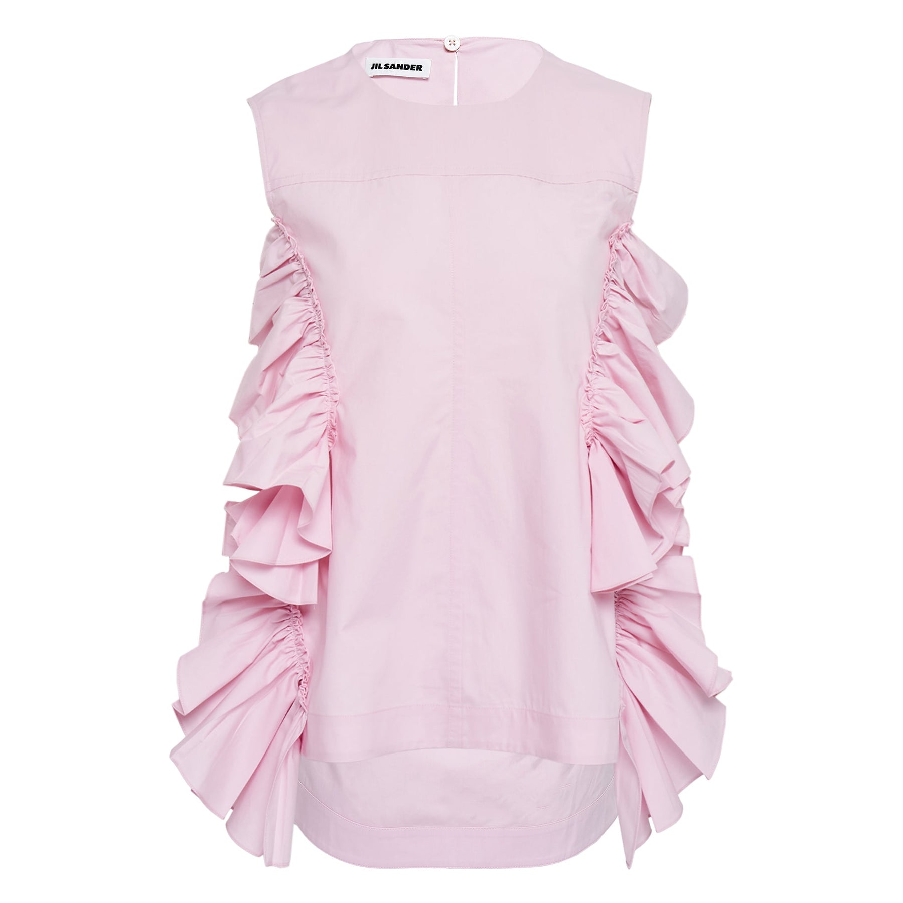 The Jil Sander Tobi Light Cotton Top delivers minimalist luxury with contemporary architectural details. Crafted from premium lightweight cotton in soft pink, featuring dramatic ruched side panels and a sleeveless silhouette. The structured construction and signature clean aesthetic create a sophisticated statement piece with avant-garde sensibility.
