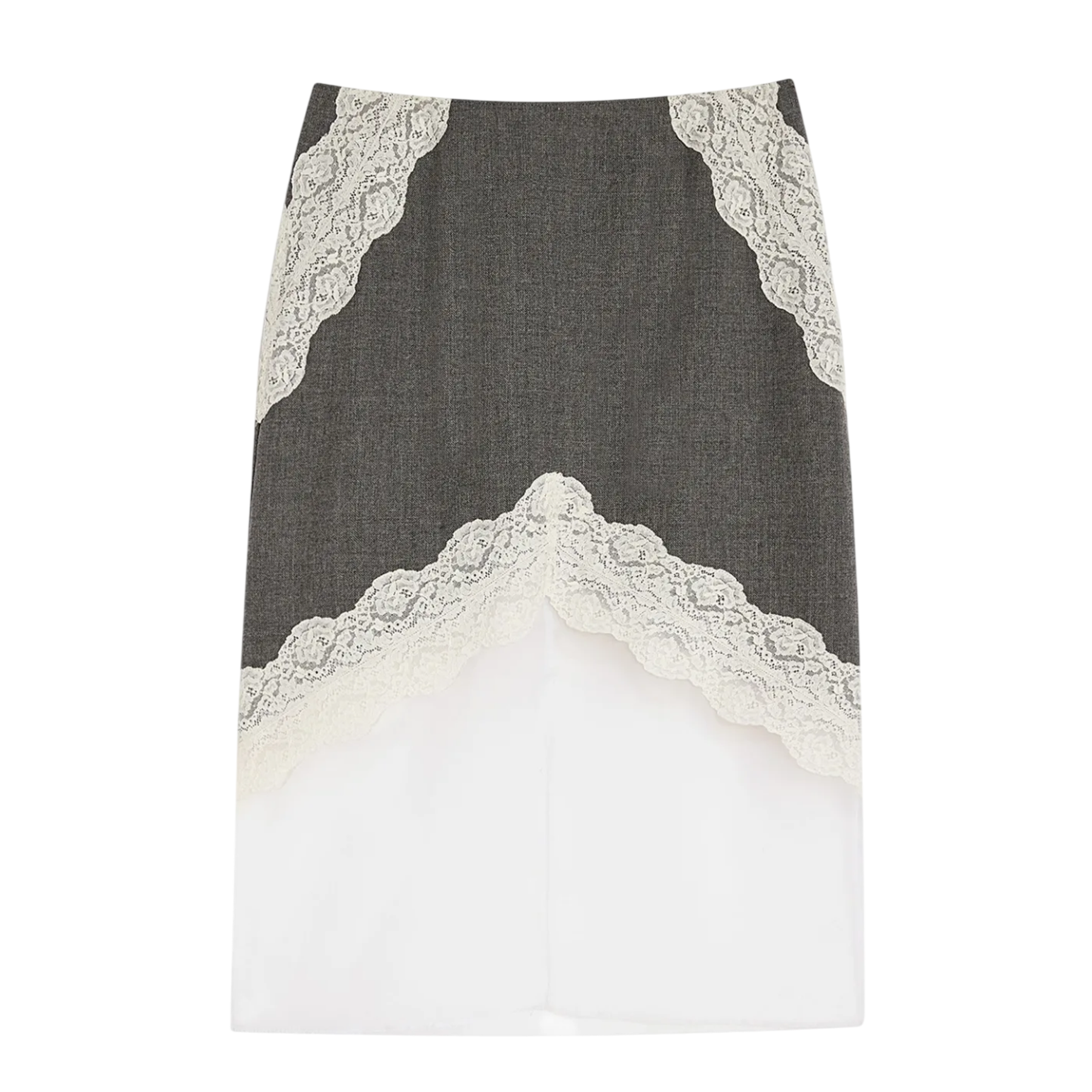The Jil Sander Wool Canvas Skirt delivers minimalist sophistication with architectural precision and modern femininity. Crafted from structured wool canvas in charcoal gray with contrasting ivory lace appliqué details, showcasing the brand's signature clean aesthetic. The color-blocked design and delicate lace trim create a refined statement piece that balances contemporary edge with timeless elegance.