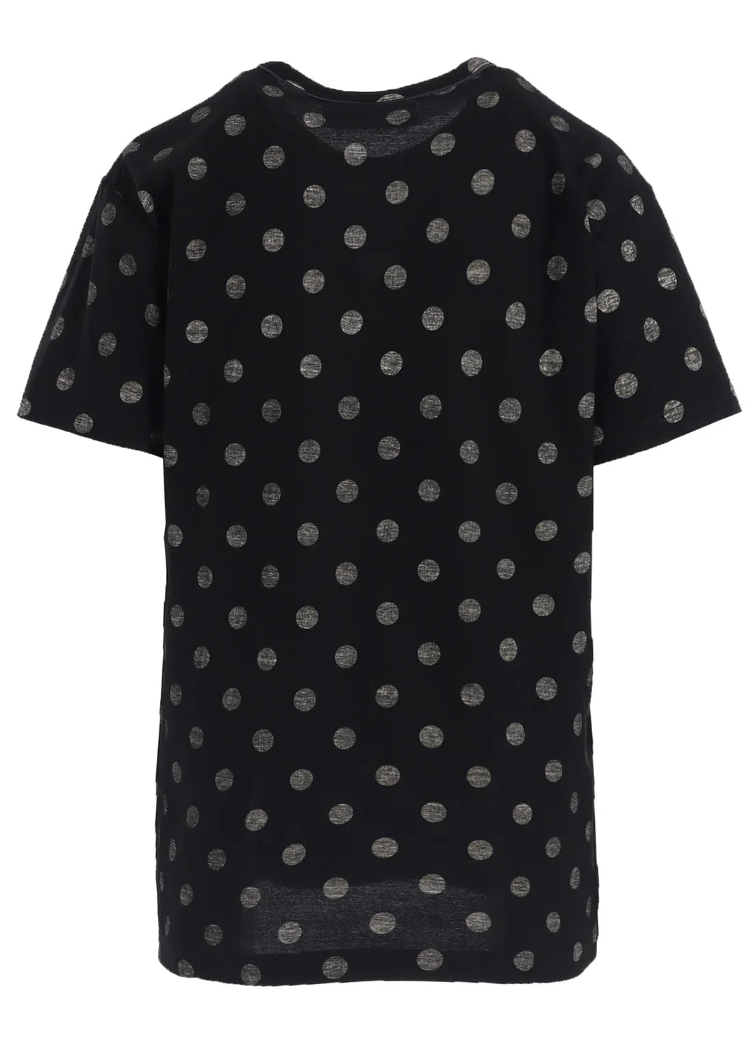 Y's cotton top features distinctive embroidered branding with a polka-dot design. It offers a slightly relaxed silhouette suitable for all genders. The neckline features an accent color line for subtle detail, making it a versatile addition to any wardrobe.