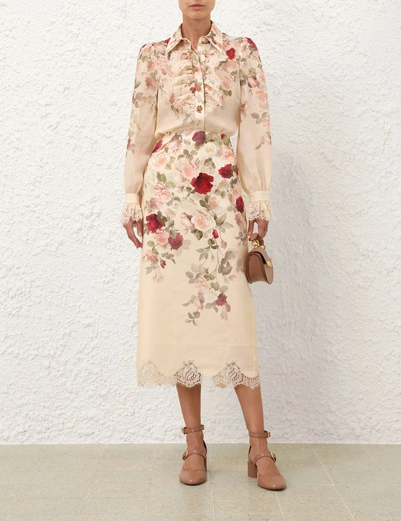 The Zimmermann Hypnotic Pencil Skirt delivers romantic femininity with sophisticated silhouette and artisanal craftsmanship. Crafted from premium silk with dreamy floral print in soft rose and burgundy tones, featuring delicate lace trim detailing at the hem. The figure-flattering pencil cut and signature Zimmermann botanical aesthetic create an enchanting piece for elevated occasions.