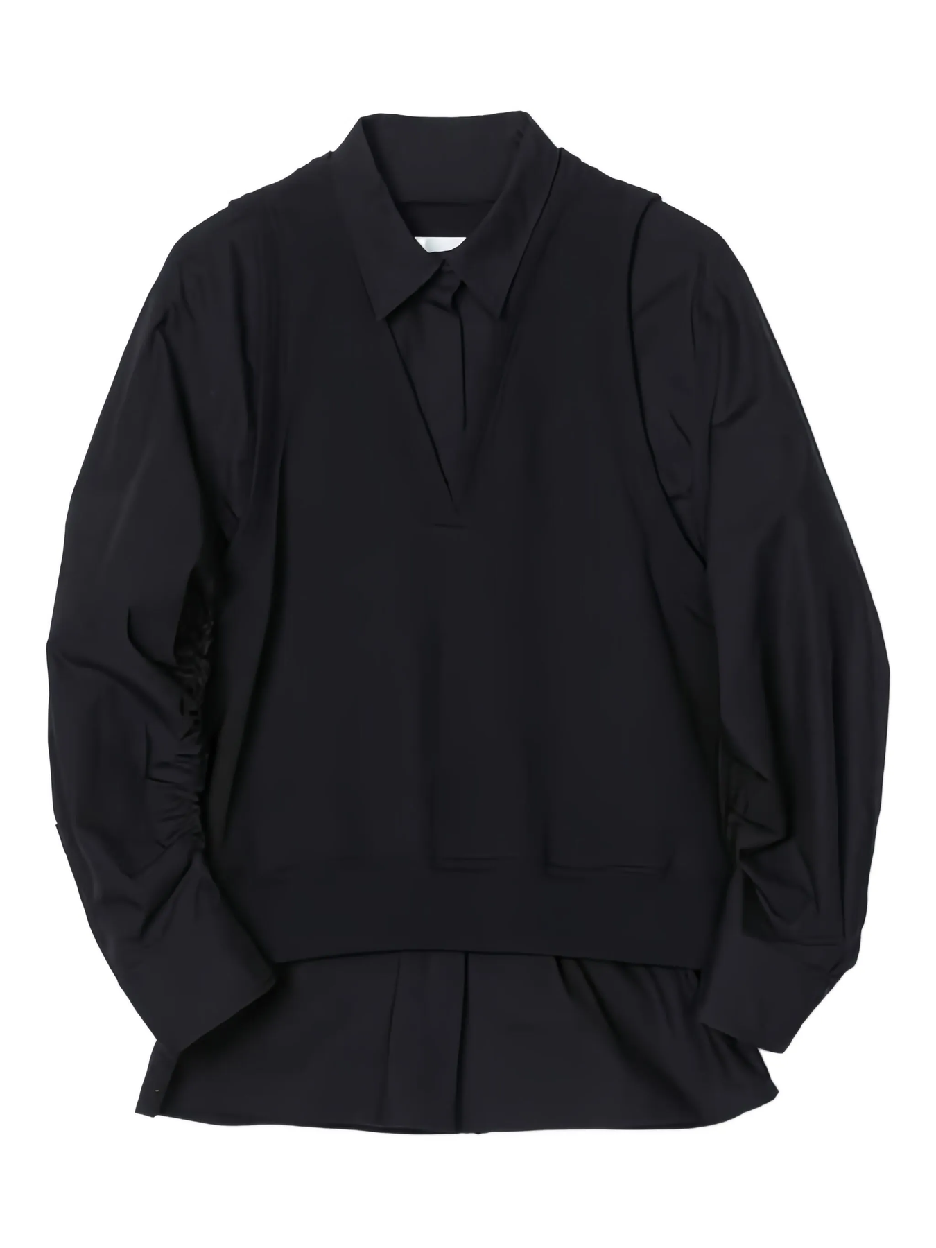 Our signature trompe l'oeil effect, this clever twist on classic layering fuses crisp cotton shirting with a built-in French terry vest-balancing utility with refined ease. The collared shirt features ruched sleeves for subtle volume, while the V-neck sweatshirt overlay lends dimension and casual contrast. Structured yet soft, polished yet playful-it's an ode to duality, crafted for the Curious Adventurer navigating transitional moments with quiet confidence and joyful intention.