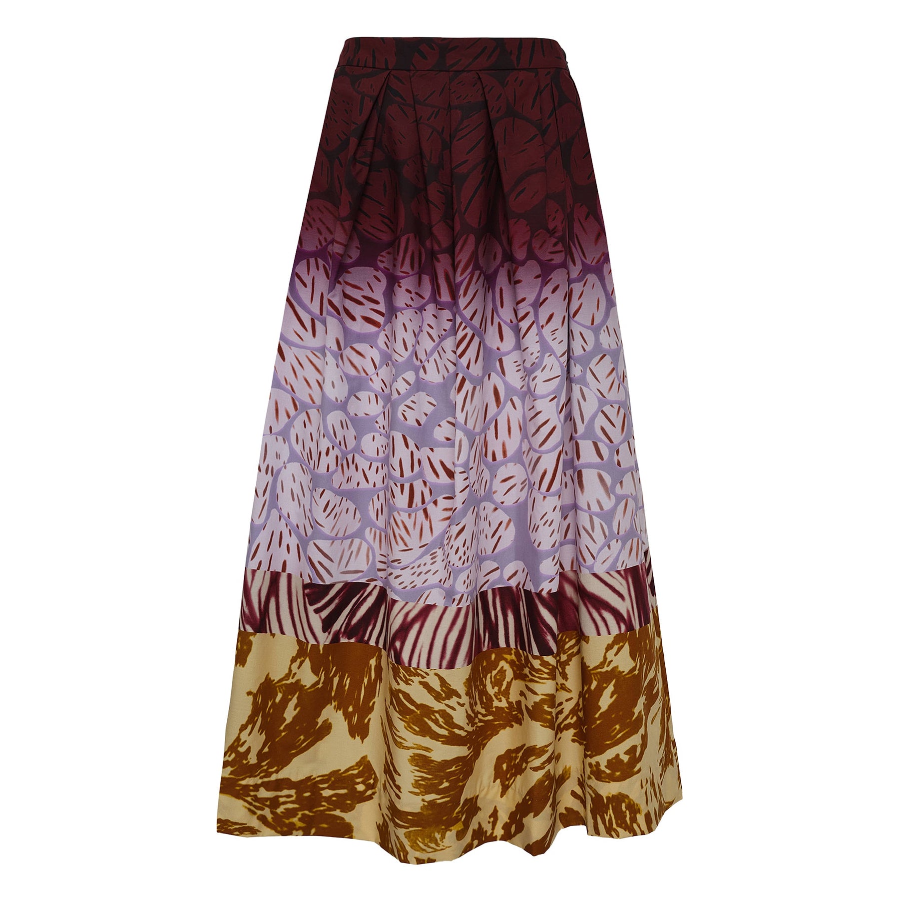 Dries Van Noten A-Line Full Midi Skirt delivers artistic expression through luxurious silhouette and signature botanical prints. Crafted from premium flowing fabric with an ombre floral pattern transitioning from deep burgundy to soft lavender and golden tones. The full A-line construction and midi length create an elegant feminine silhouette that embodies the brand's avant-garde aesthetic.