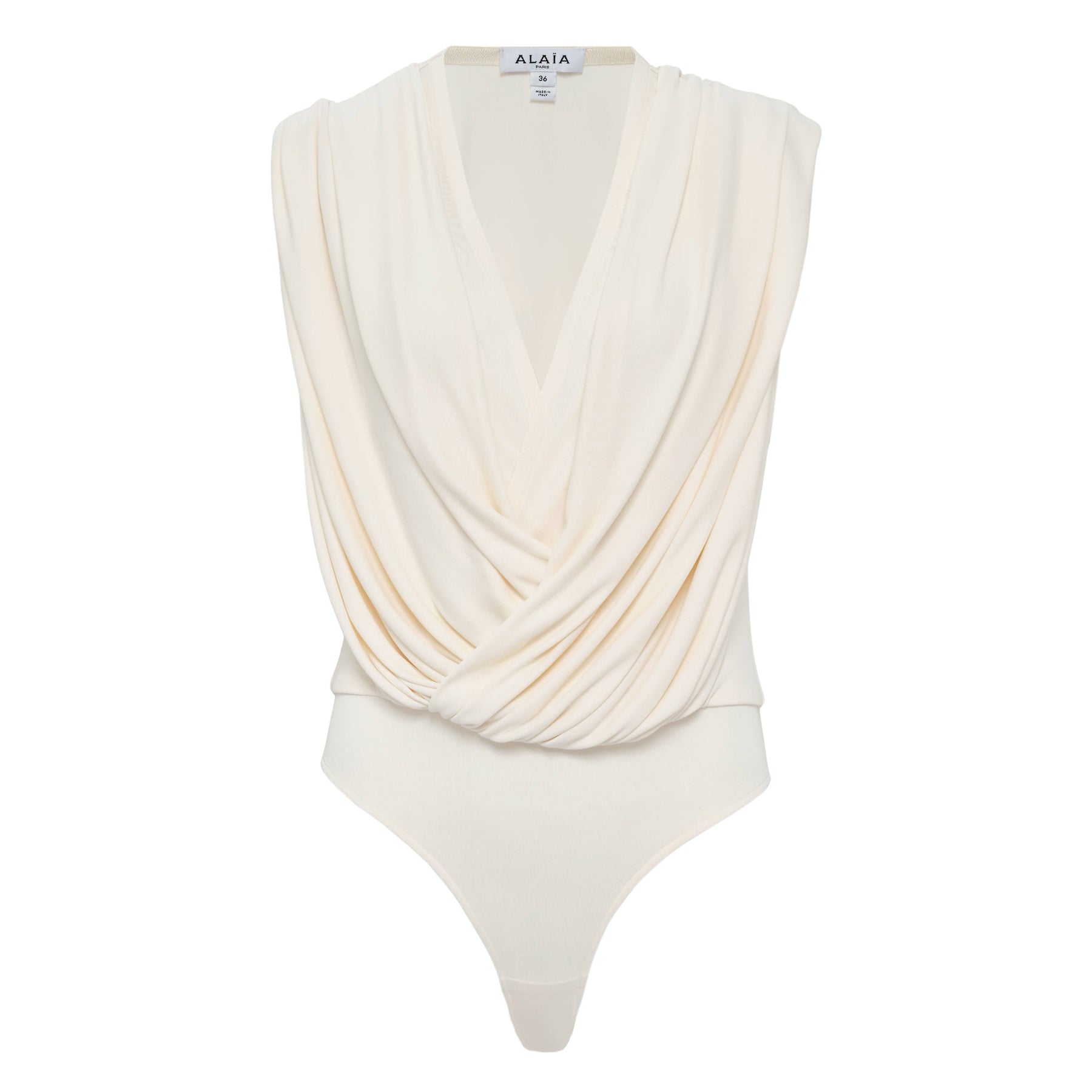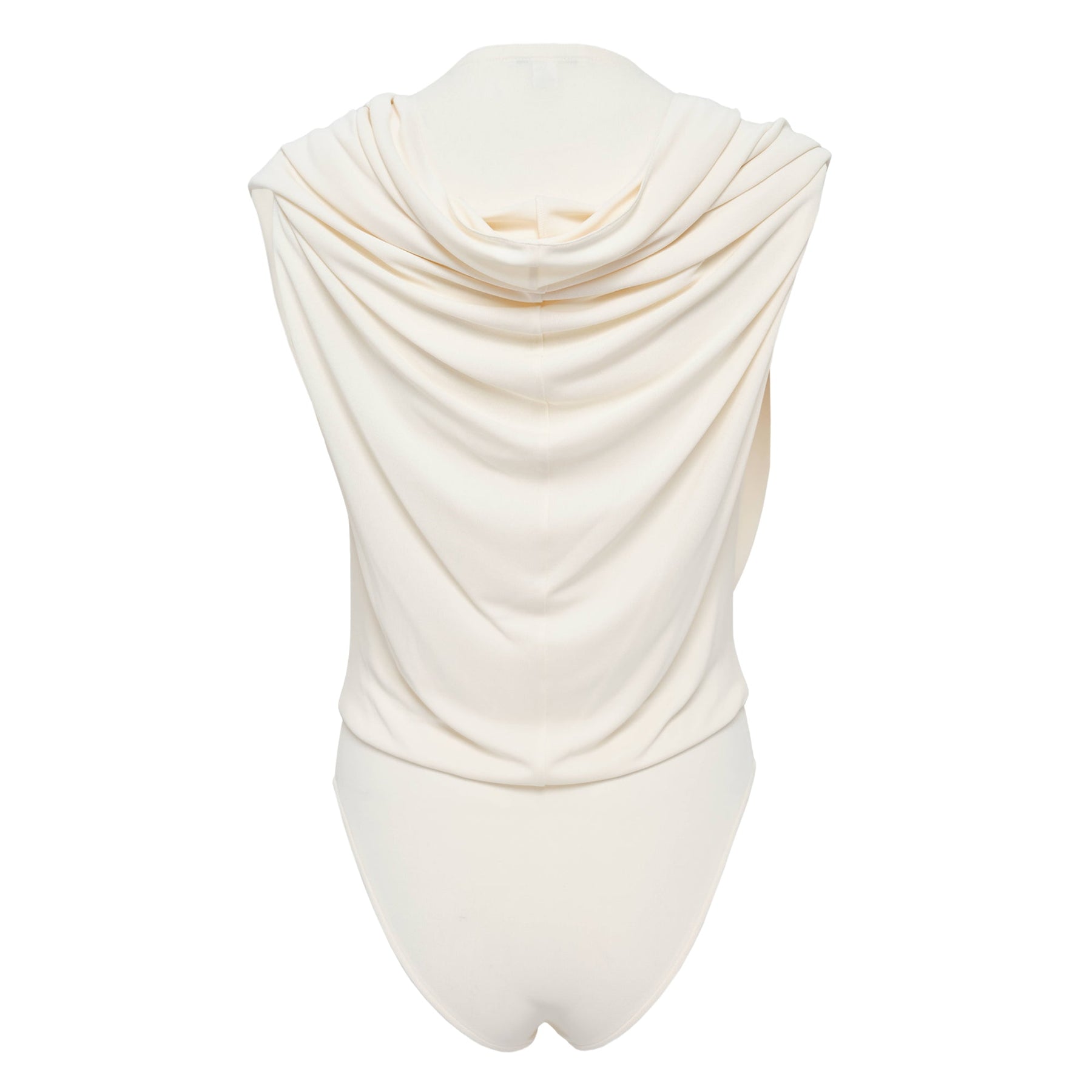 ALAIA Hooded Body Jersey delivers sculptural elegance with the brand's signature body-conscious silhouette. Crafted from premium stretch jersey in ivory, featuring a dramatic draped cowl neckline and sleeveless construction. The sophisticated draping and figure-flattering fit showcase ALAIA's mastery of technical knitwear design.