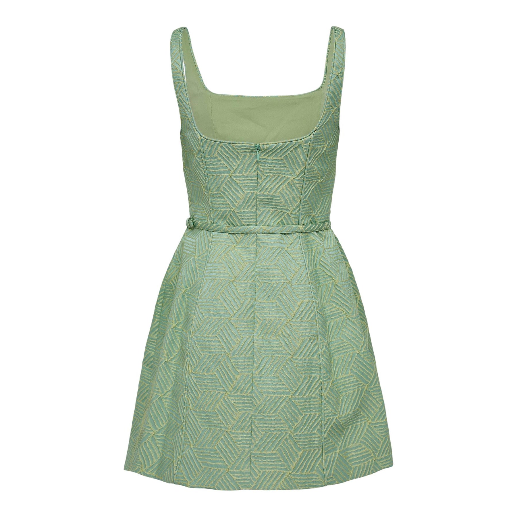 The Bijoux Dress is a textured jacquard mini dress featuring piping accents and a removable belt that cinches the waist.