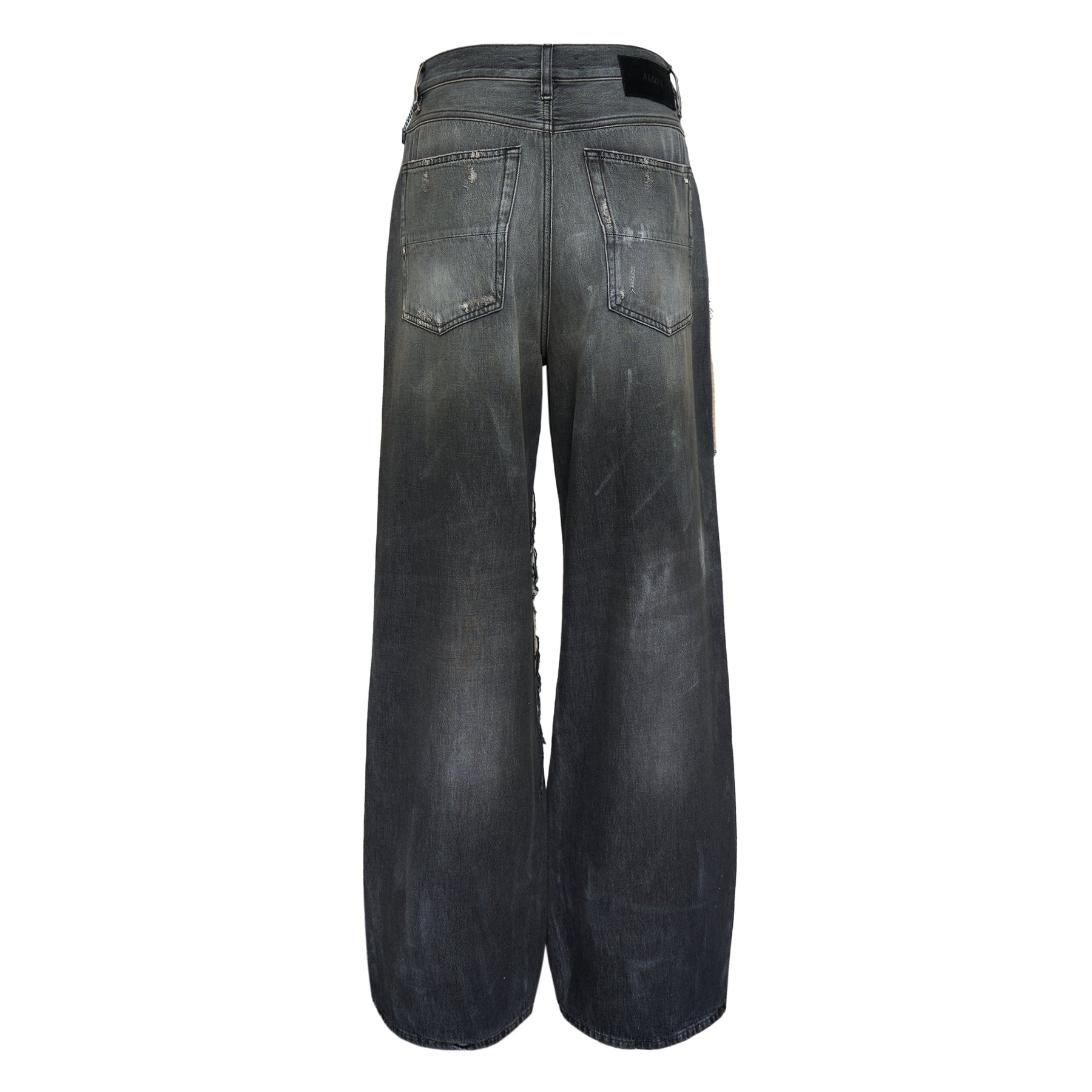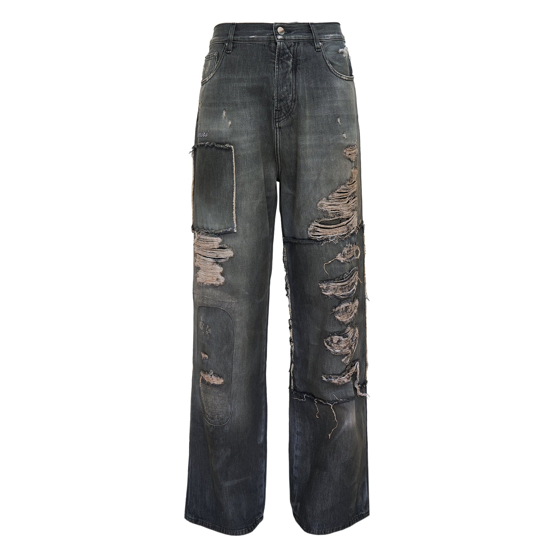 AMIRI Carpenter Repaired Baggy Jean delivers luxury streetwear with artisanal distressed detailing and relaxed contemporary fit. Crafted from premium Japanese denim in charcoal gray wash, featuring extensive hand-distressed repairs, strategic patches, and exposed frayed elements throughout. The baggy silhouette and carpenter-inspired construction showcase AMIRI's signature rock-and-roll aesthetic with rebellious craftsmanship.