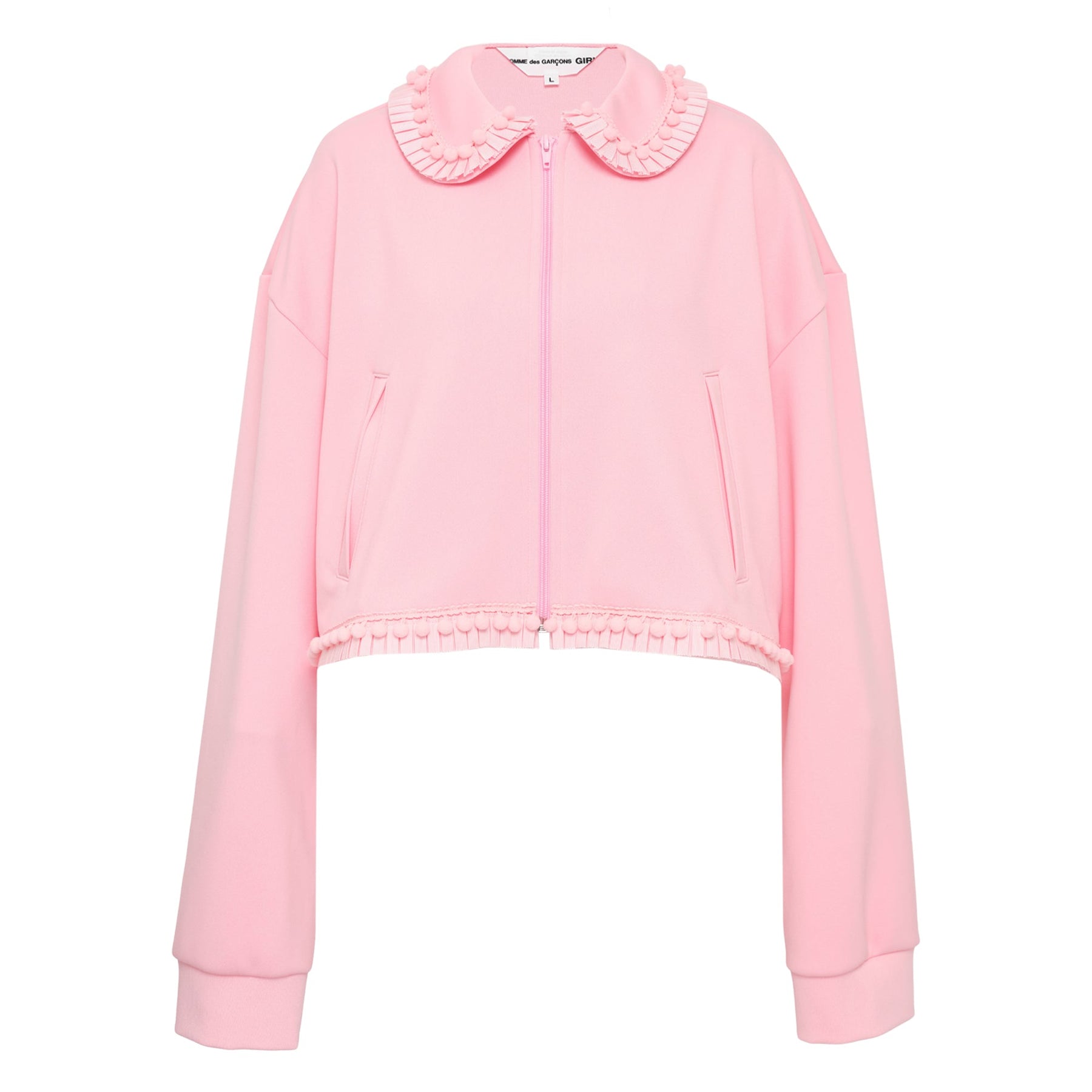 The COMME des GARCONS GIRL Applique Cropped Hoodie delivers playful avant-garde design with signature feminine touches. Crafted from soft cotton fleece in powder pink, featuring decorative ruffled collar details and elasticated hem construction. The cropped silhouette and whimsical applique elements showcase the brand's innovative approach to contemporary streetwear.