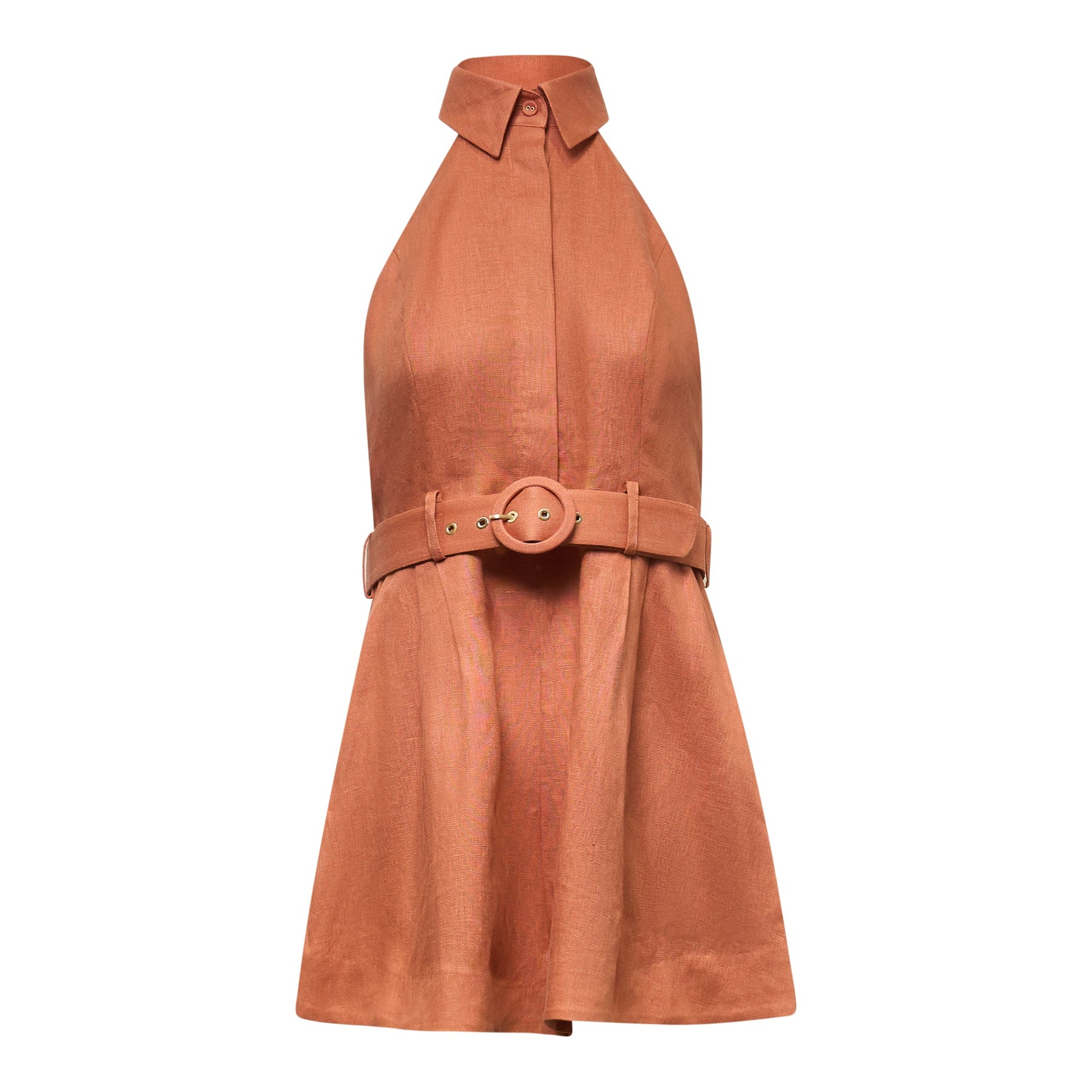 ZIMMERMANN Awaken Halter Playsuit delivers effortless luxury with refined tailoring and flattering silhouette. Crafted from premium linen in warm terracotta, featuring a structured halter neckline and matching belt for waist definition. The signature Australian aesthetic combines relaxed sophistication with contemporary feminine design.