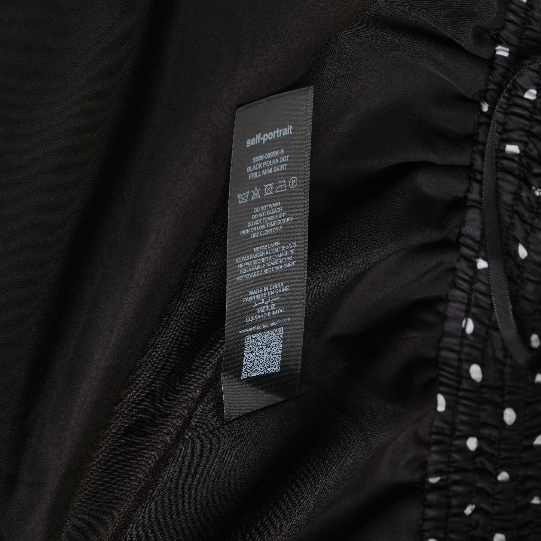 Self-Portrait Black Polka Dot Frill Mini Skirt delivers feminine sophistication with playful retro-inspired detailing. Crafted from lightweight chiffon fabric featuring classic white polka dots on black base, with tiered ruffle layers and contrasting white piping trim. The elasticated waistband and asymmetrical pleated construction create movement and flattering silhouette for elevated occasion dressing.