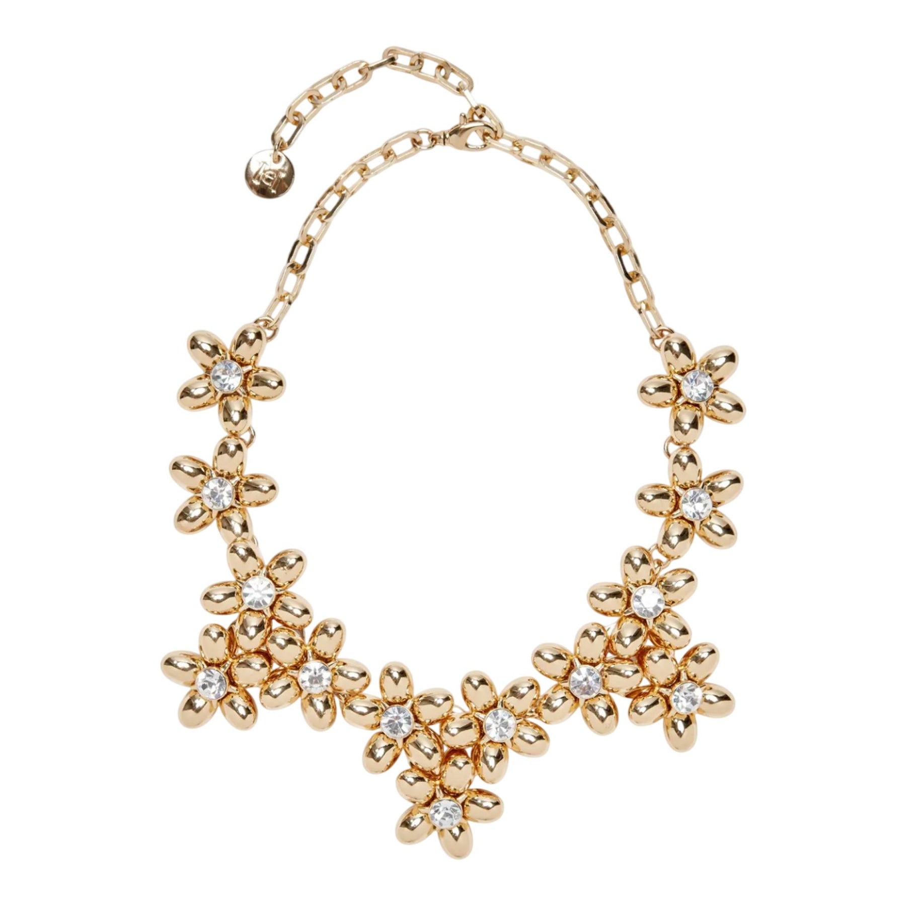 This whimsical necklace blooms with a bouquet of gilt florals, embellished with crystal centers.