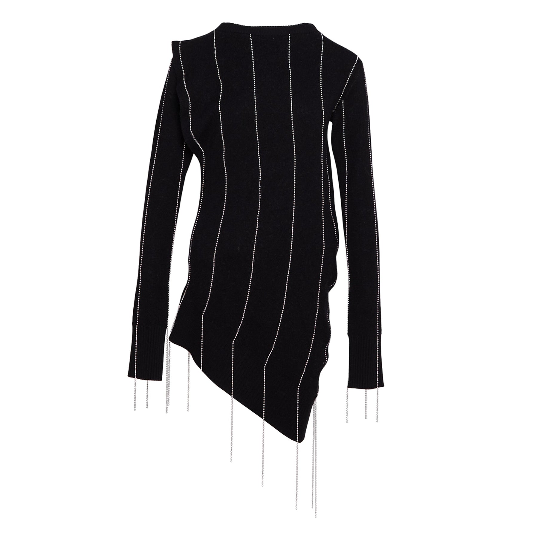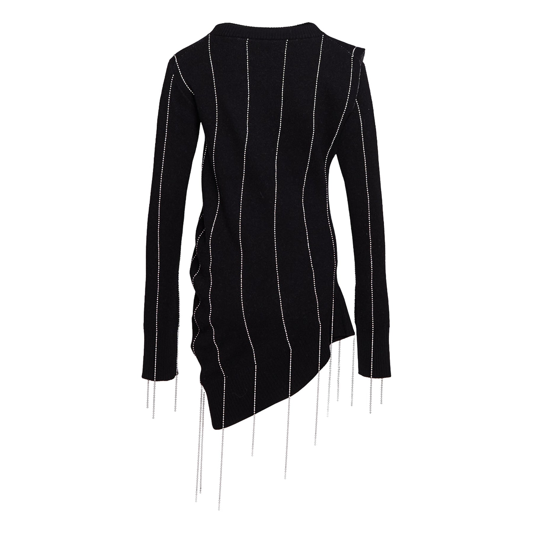 The sacai Chalk Stripe Knit Pullover delivers avant-garde Japanese design with architectural asymmetry and innovative construction. Crafted from premium black knit fabric featuring contrasting white chalk stripe detailing throughout, creating visual depth and texture. The deconstructed asymmetrical hemline with extended fringe details showcases sacai's signature approach to traditional garment silhouettes.