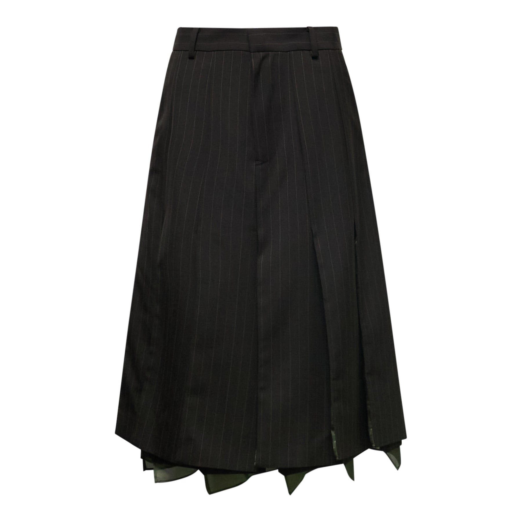 The sacai Chalk Stripe Skirt delivers avant-garde femininity with the brand's signature hybrid construction and architectural tailoring. Crafted from premium wool suiting fabric in deep charcoal with contrasting chalk pinstripes, featuring pleated detailing and asymmetrical layered panels. The deconstructed silhouette and innovative fabric mixing create a sophisticated statement piece that embodies sacai's experimental design philosophy.